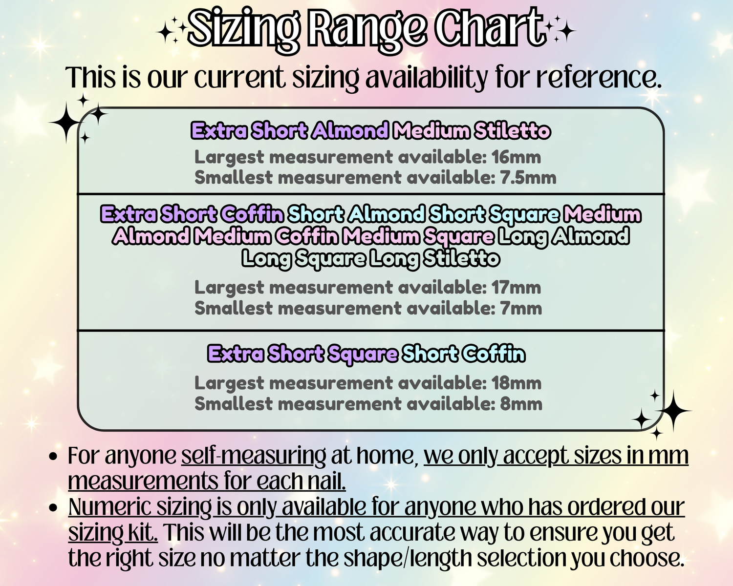 1. Before ordering, check our sizing range chart to ensure your measurements will work with the shape/length you select. For example, if your thumb size is 18 mm only Extra Short Square and Short Coffin provide a size that large.