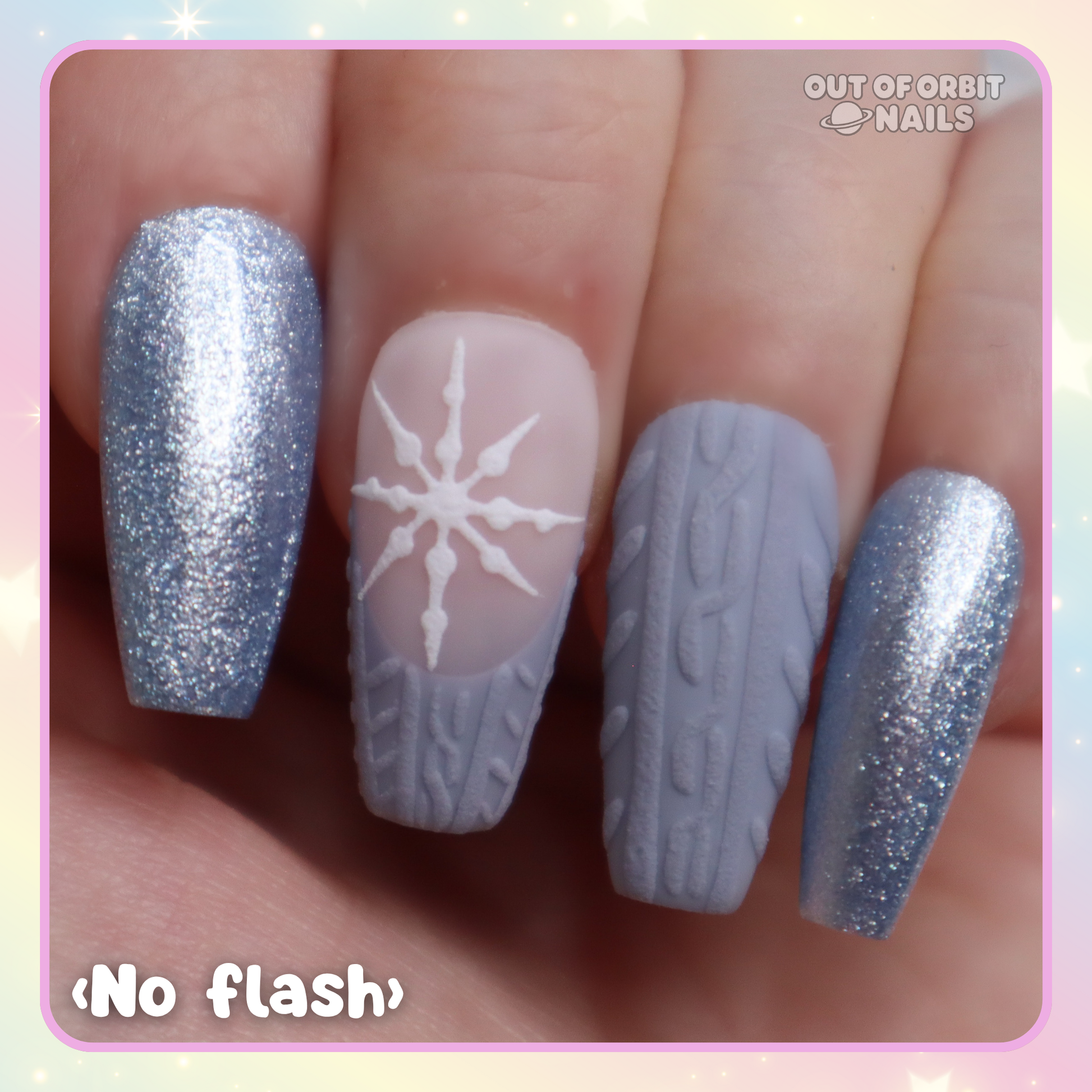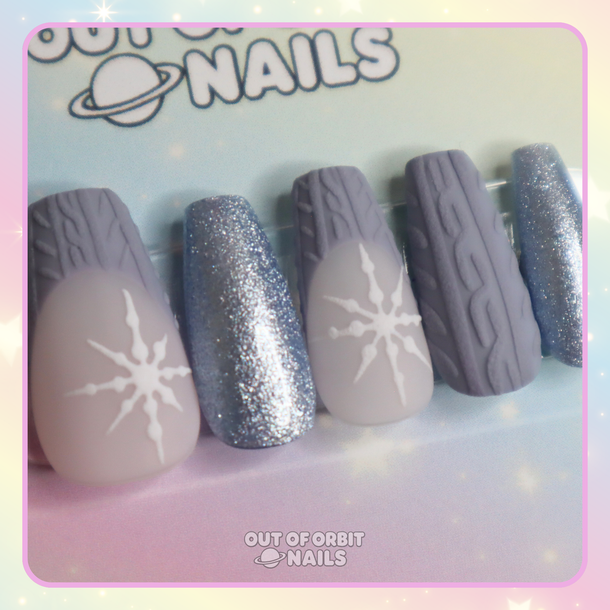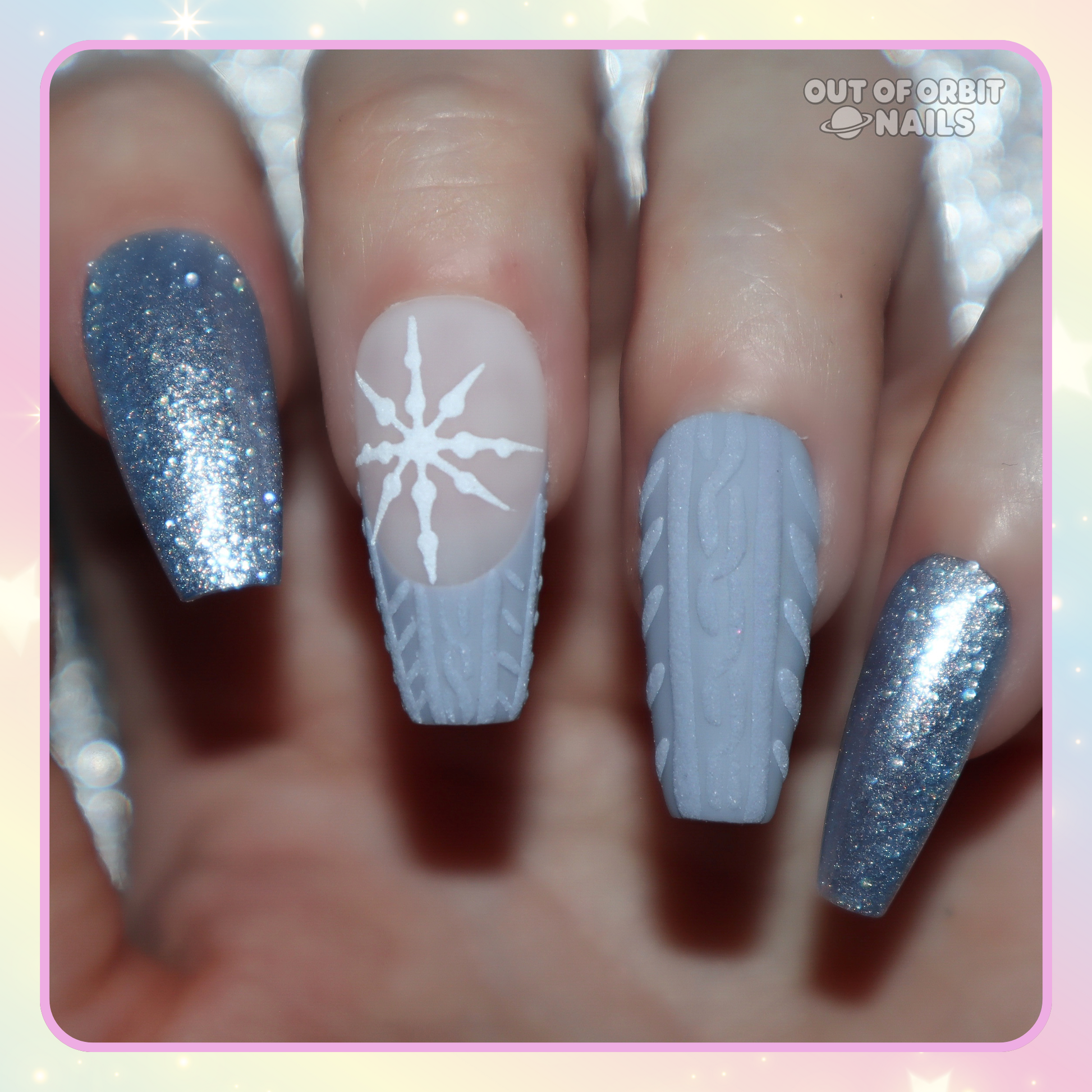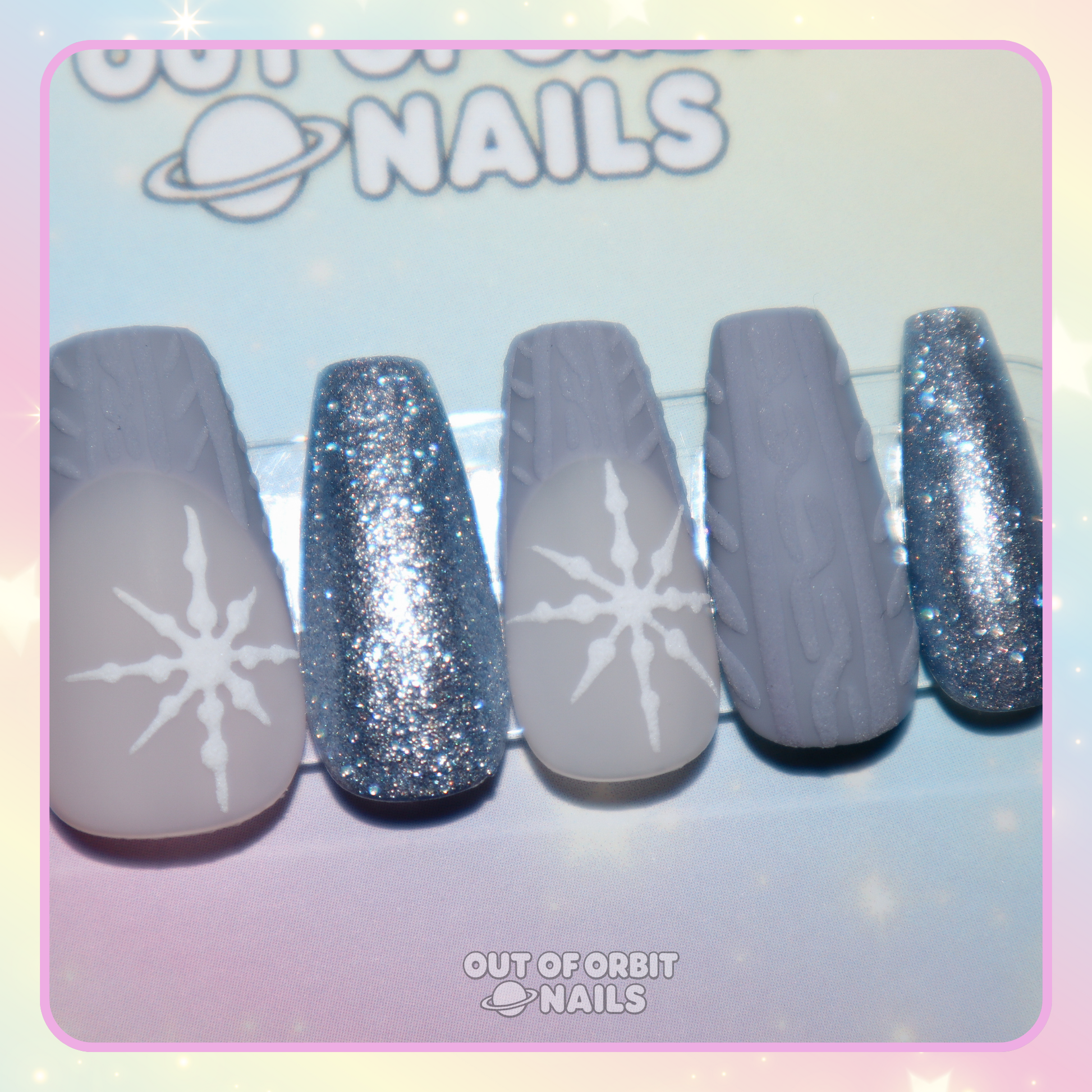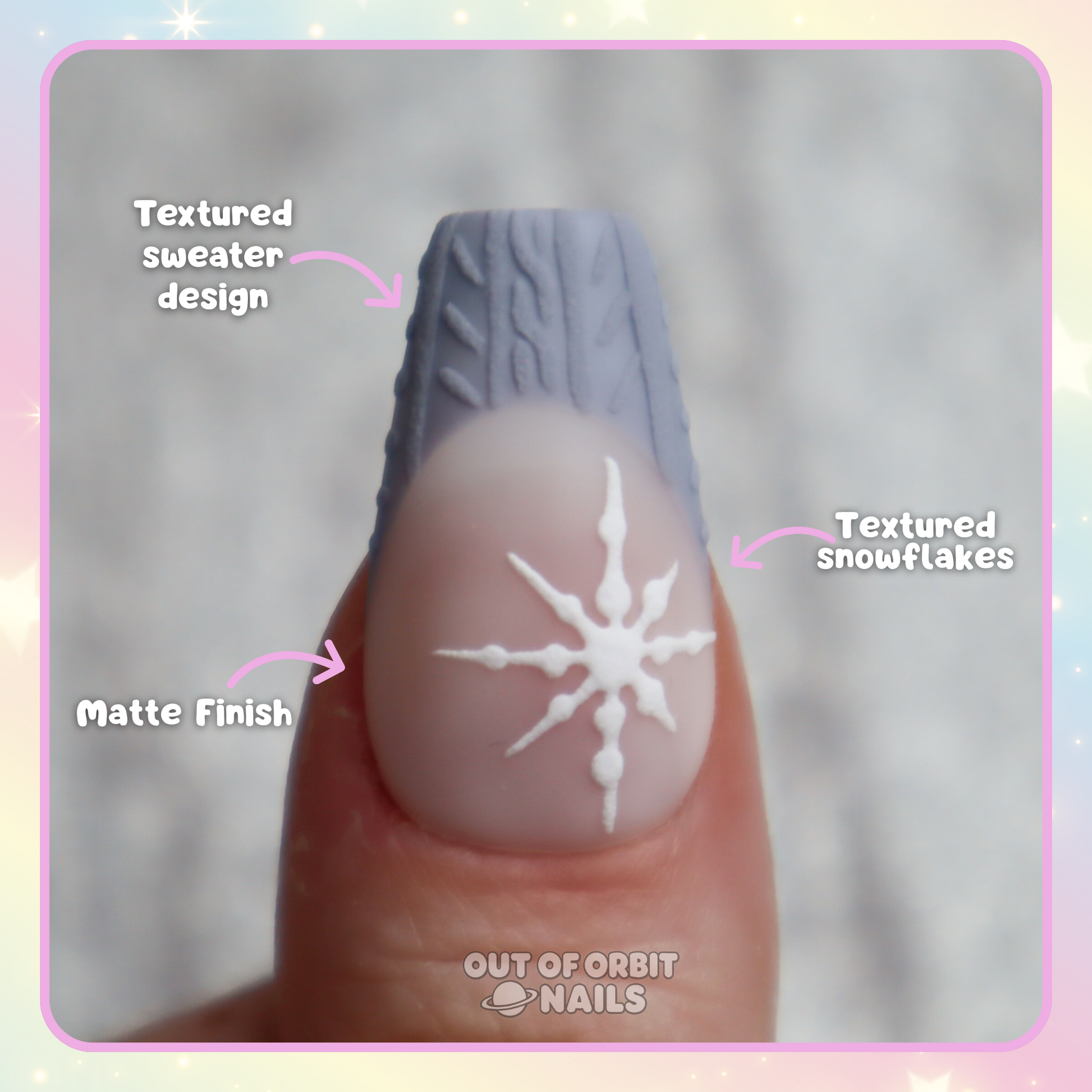 Design Features: Solid glitter nails (gloss finish), French tips with your choice of base color (base #5 is used on the set in the display photos), and textured cable knit sweater and snowflake designs (matte/textured finish).