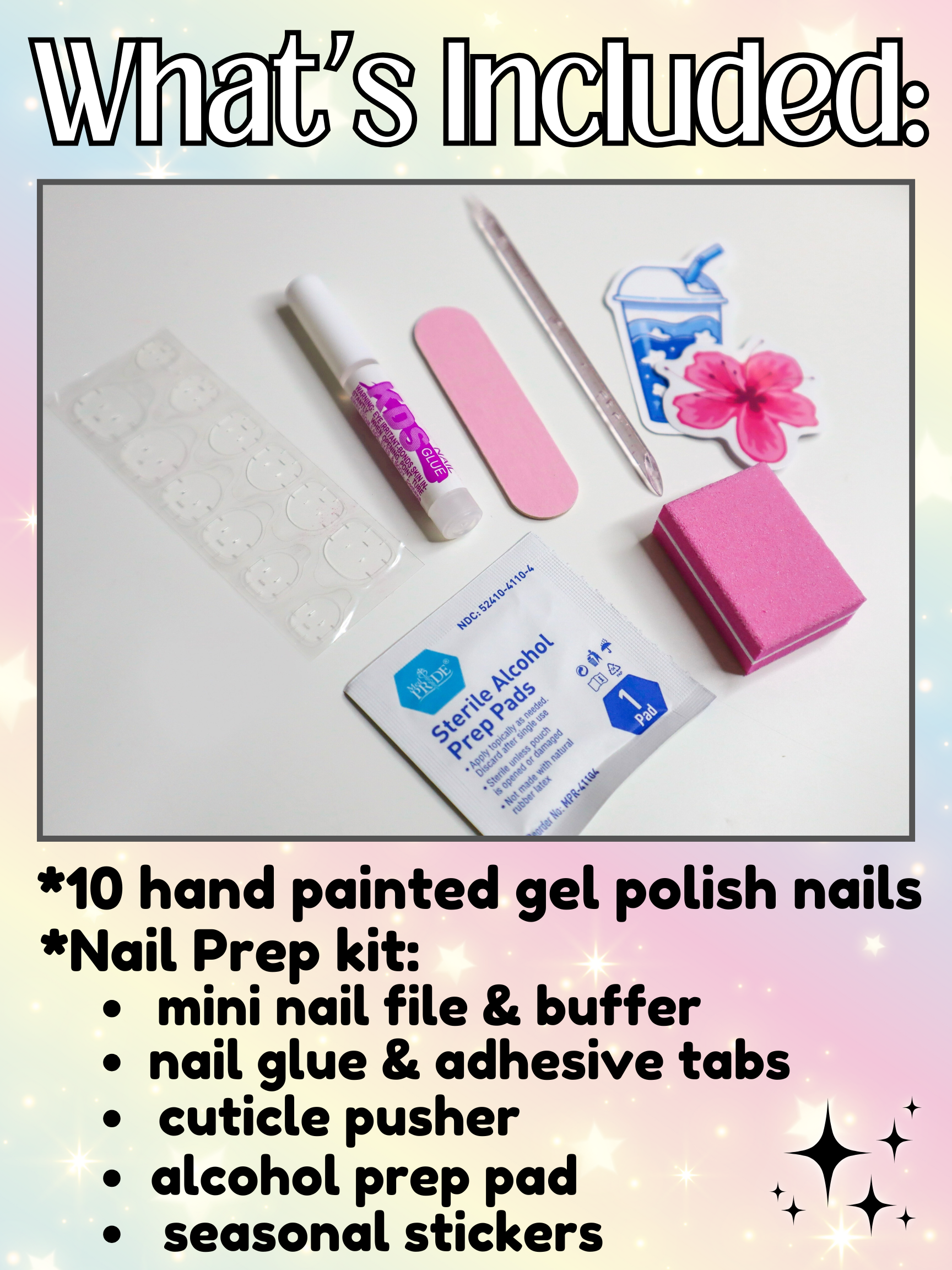 -Due to the handmade nature of the nail sets please note that sets will appear as close to the display image as possible. Adjustments will be made for sets ordered in different shapes/lengths to accommodate it best.