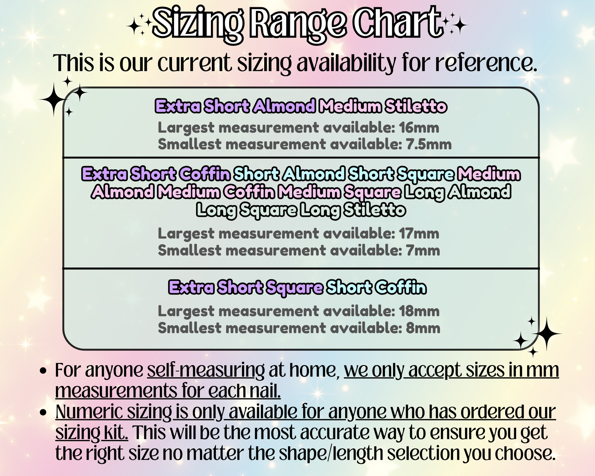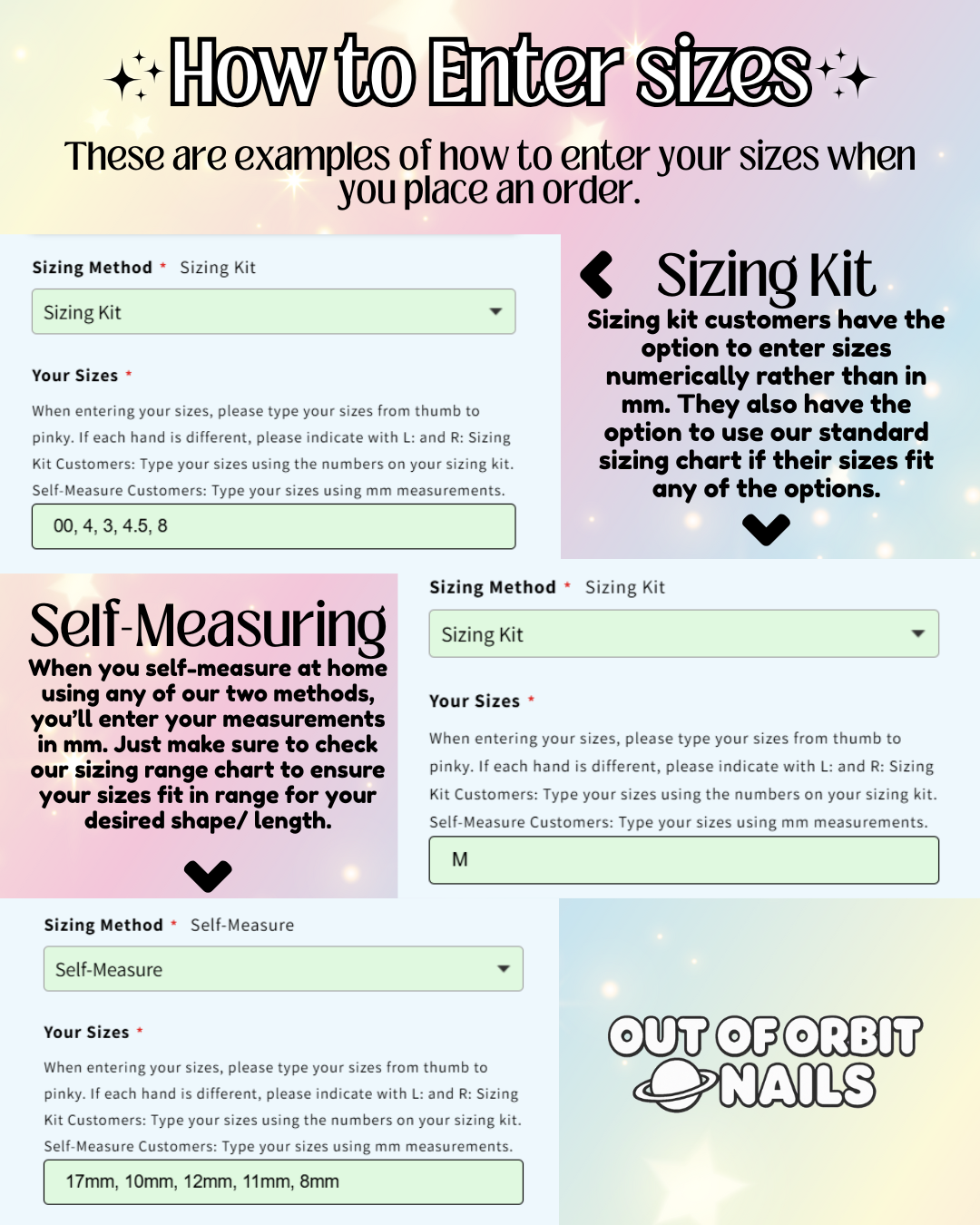 -All nail shops are different, and sizing will vary from shop to shop. Our sizing kits/charts are exclusive to Out of Orbit Nails so please be sure to size correctly before placing an order. You can view our sizing page for more information.