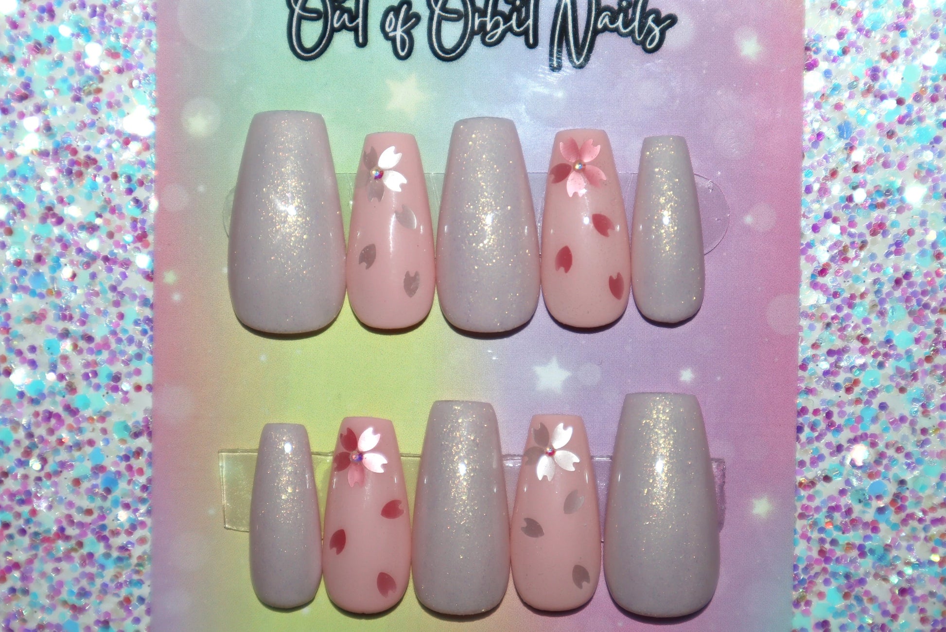 Design Features: Encapsulated Sakura blossoms/flowing petals with center iridescent rhinestone accents on the blossoms.