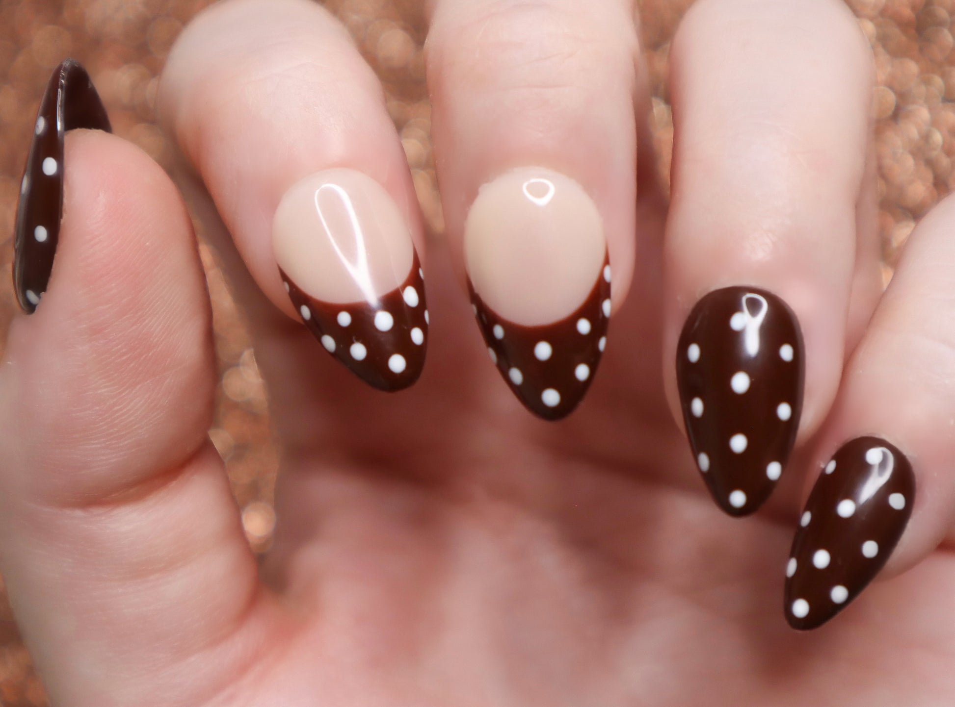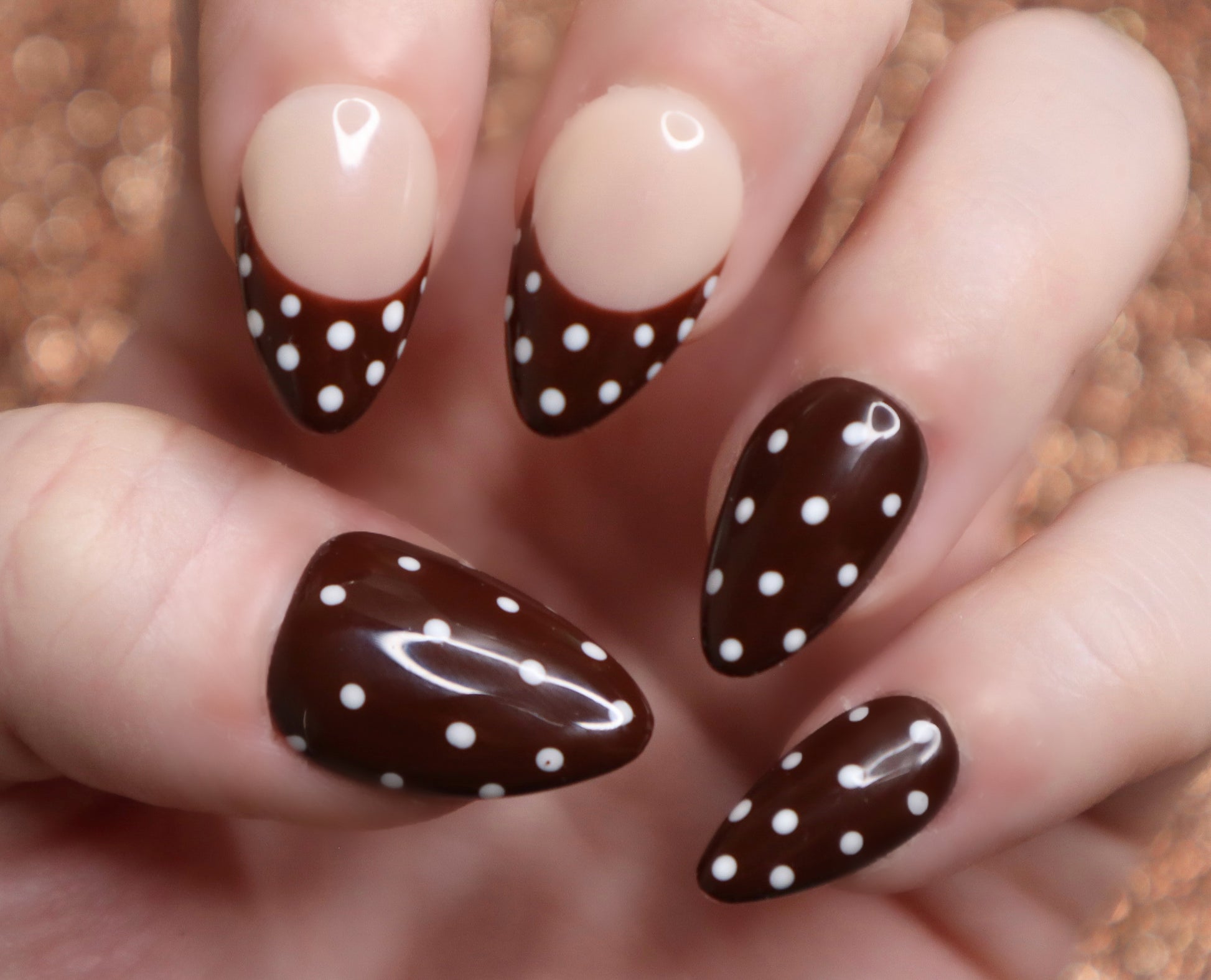 Design Features: This set features a French tip/solid chocolate brown and white polka dot design. This set also comes with the option to select your base shade for the French tips. (base #1 is used on the set in the display photos)