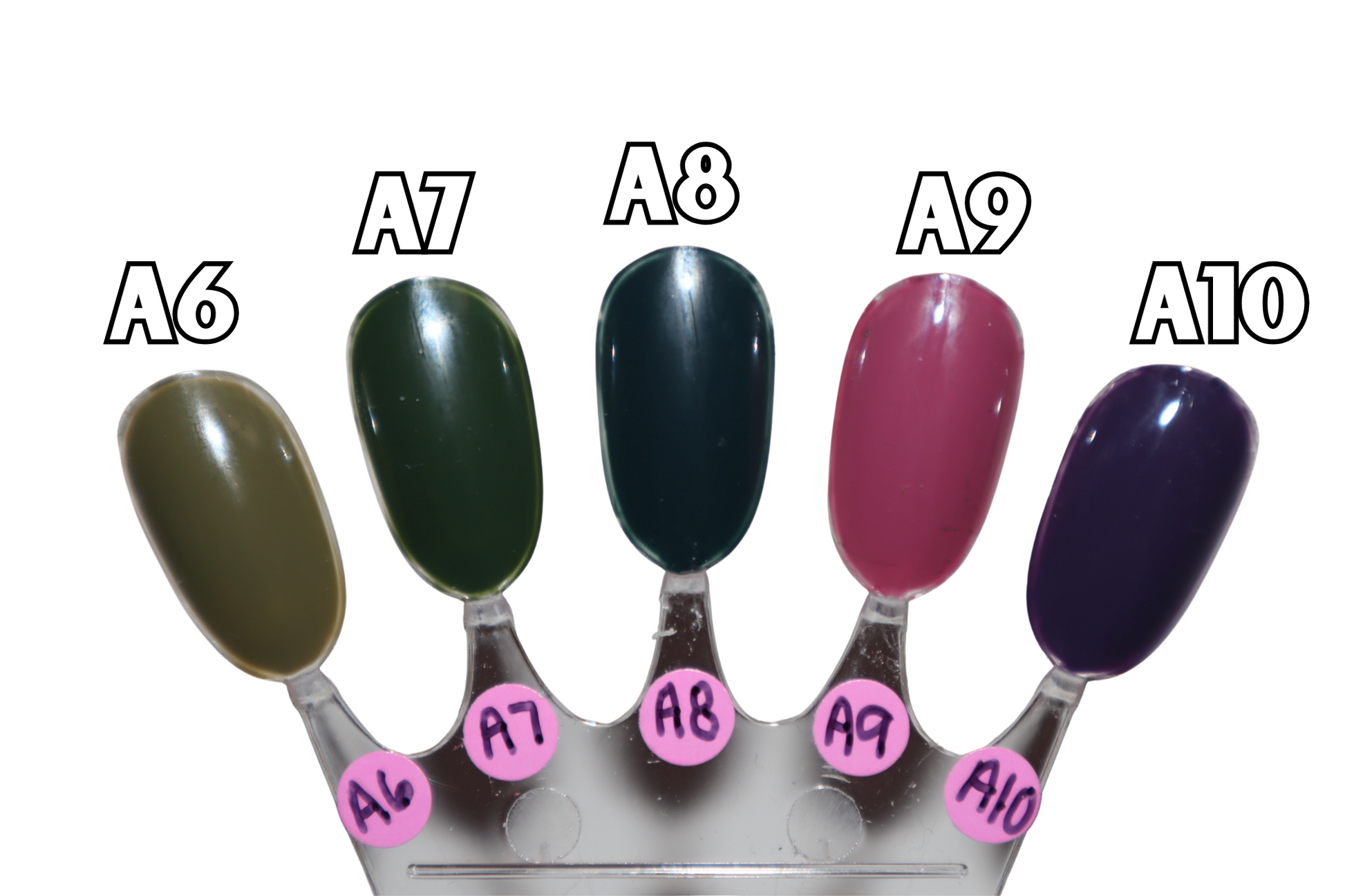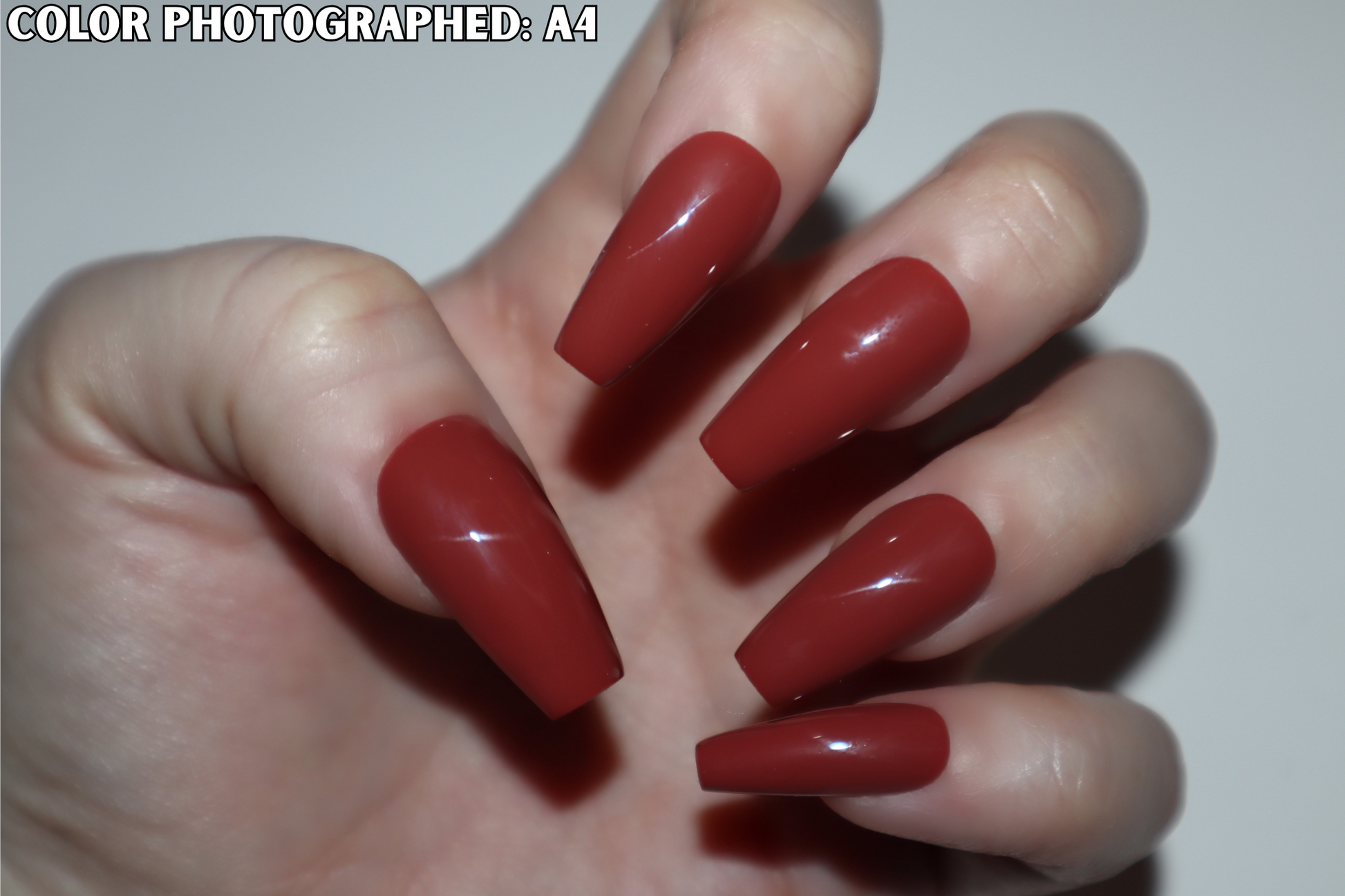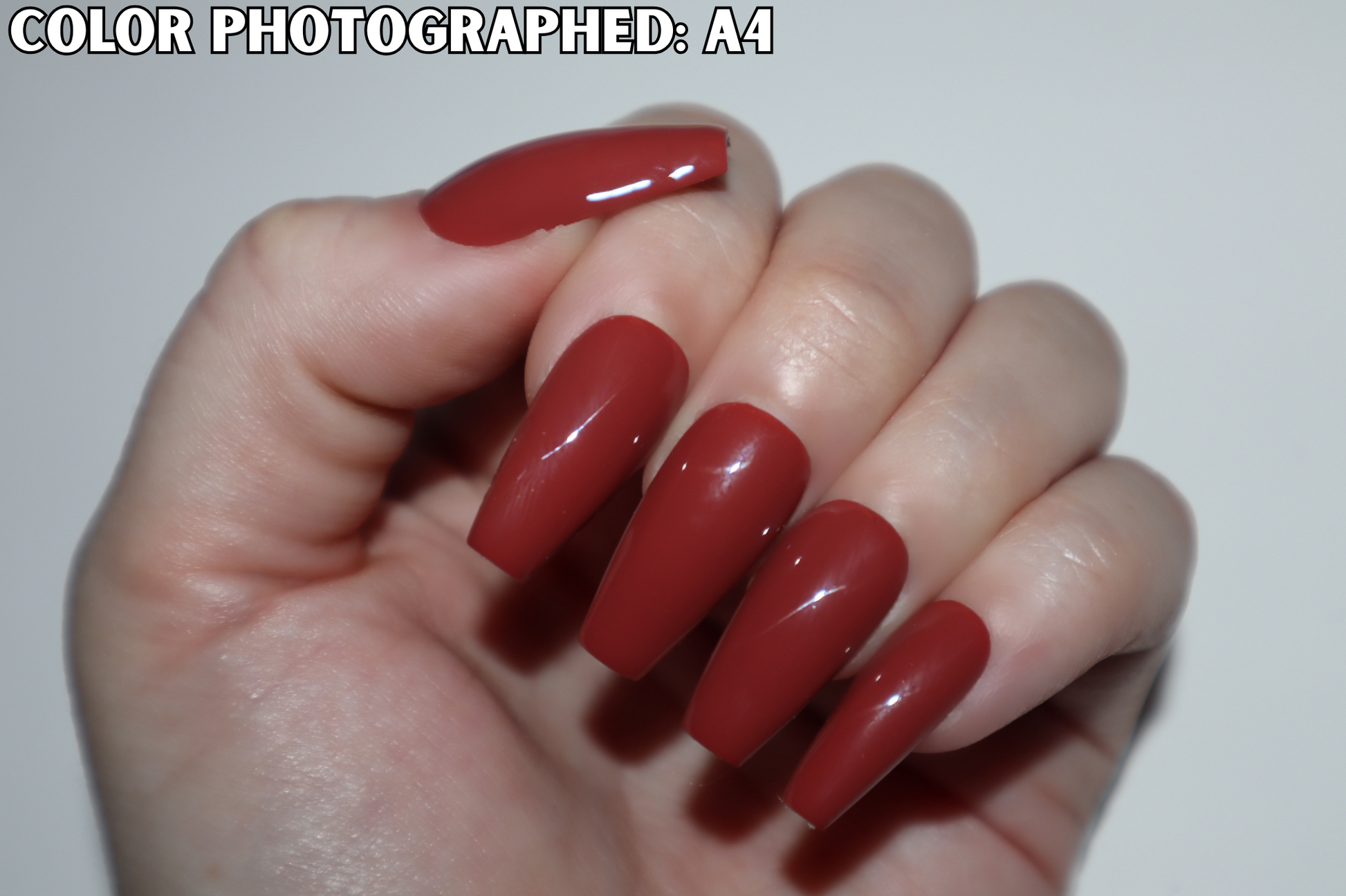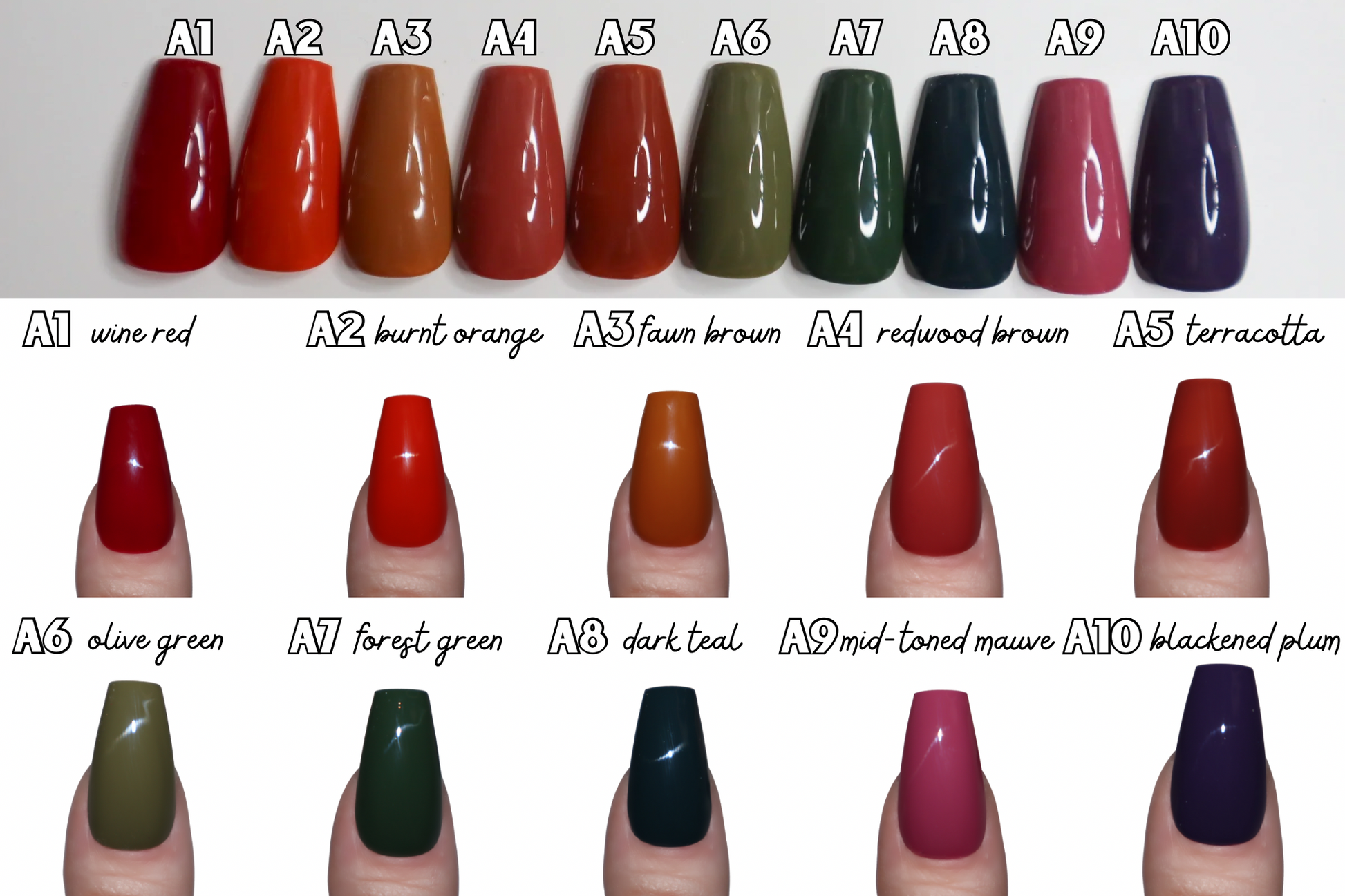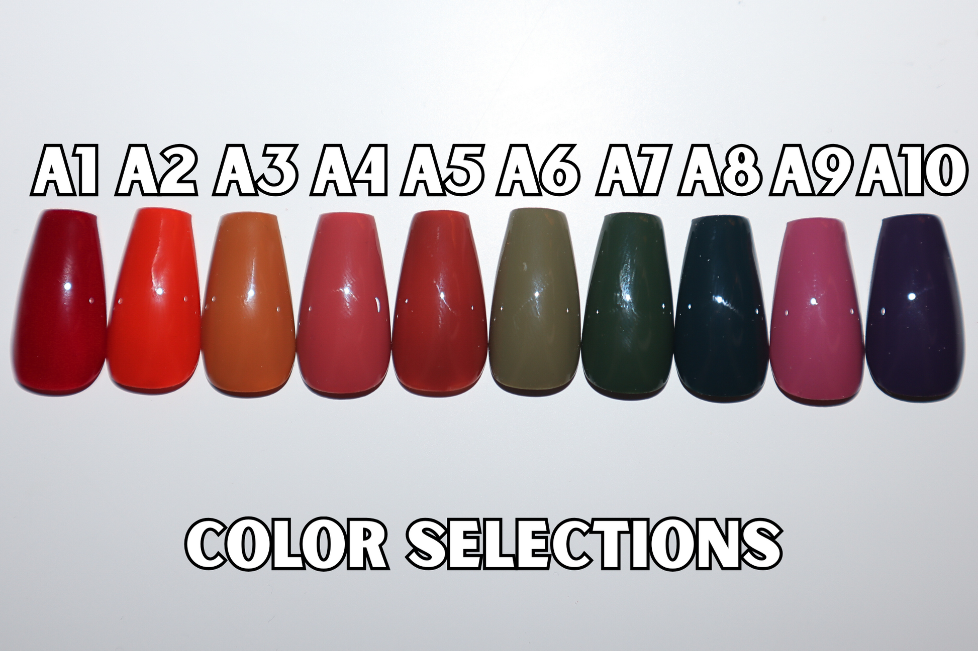 This "select your own color" set features a color palette inspired by the shades of autumn. You can select any of these shades for your set as well as a gloss or matte top coat. Color descriptions are below.