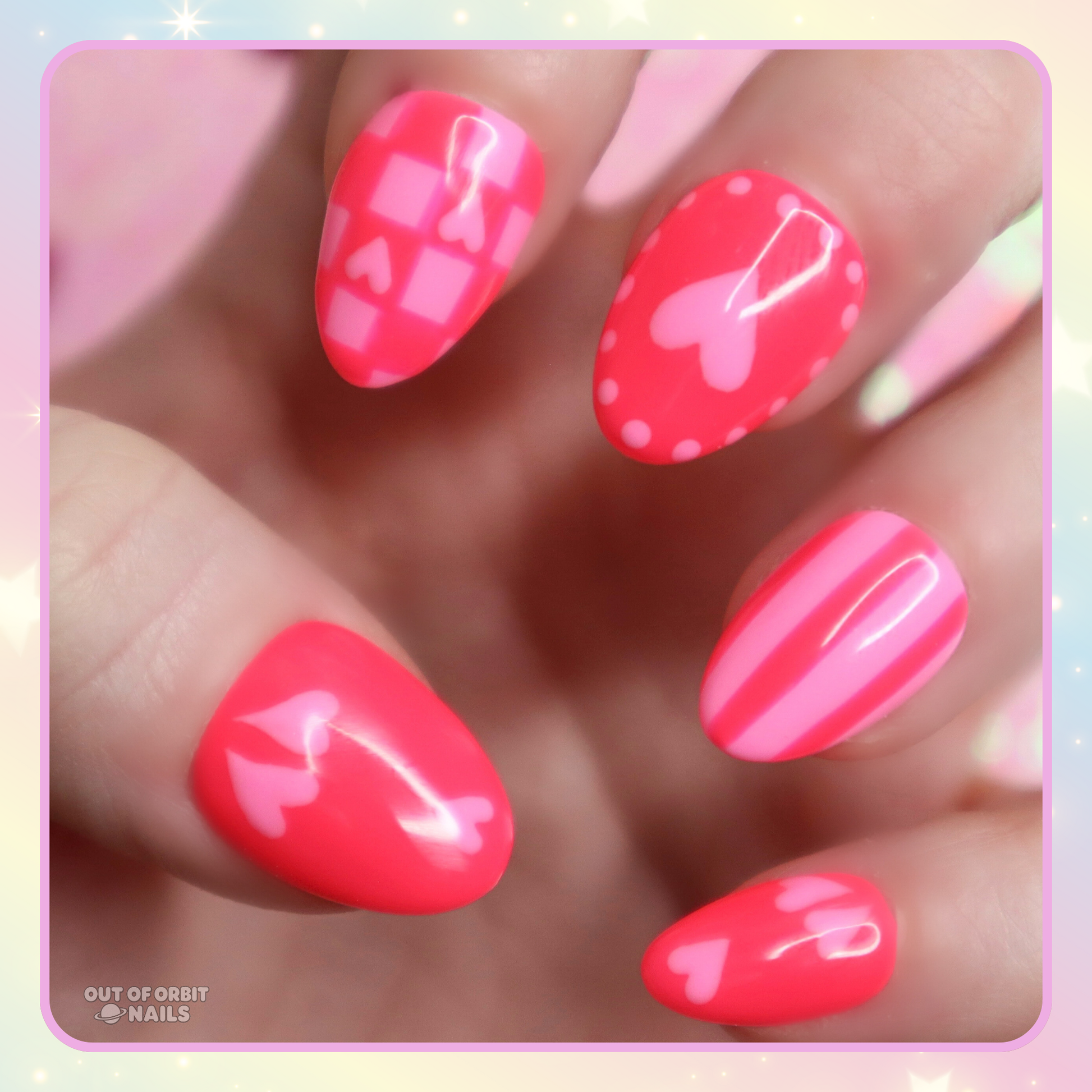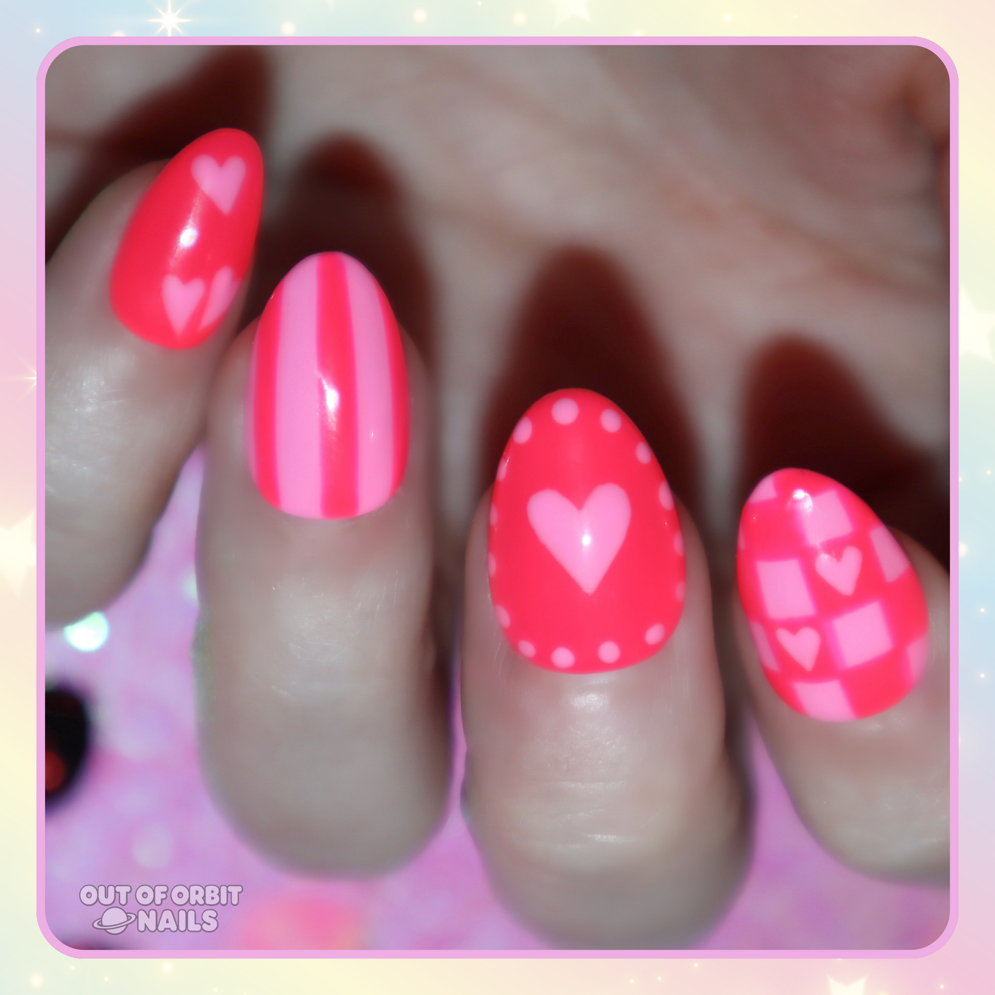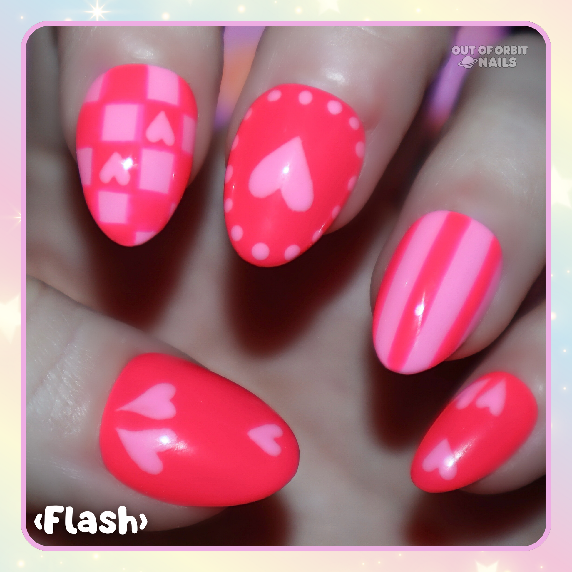 Design Features: Fully hand painted art design with different cute and trendy patterns with a Valentine’s Day twist! This has a duo color palette of bright neon coral red and bright bubblegum pink.