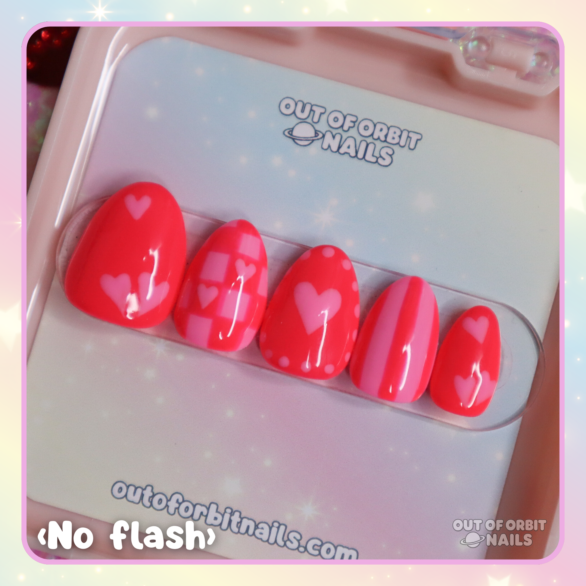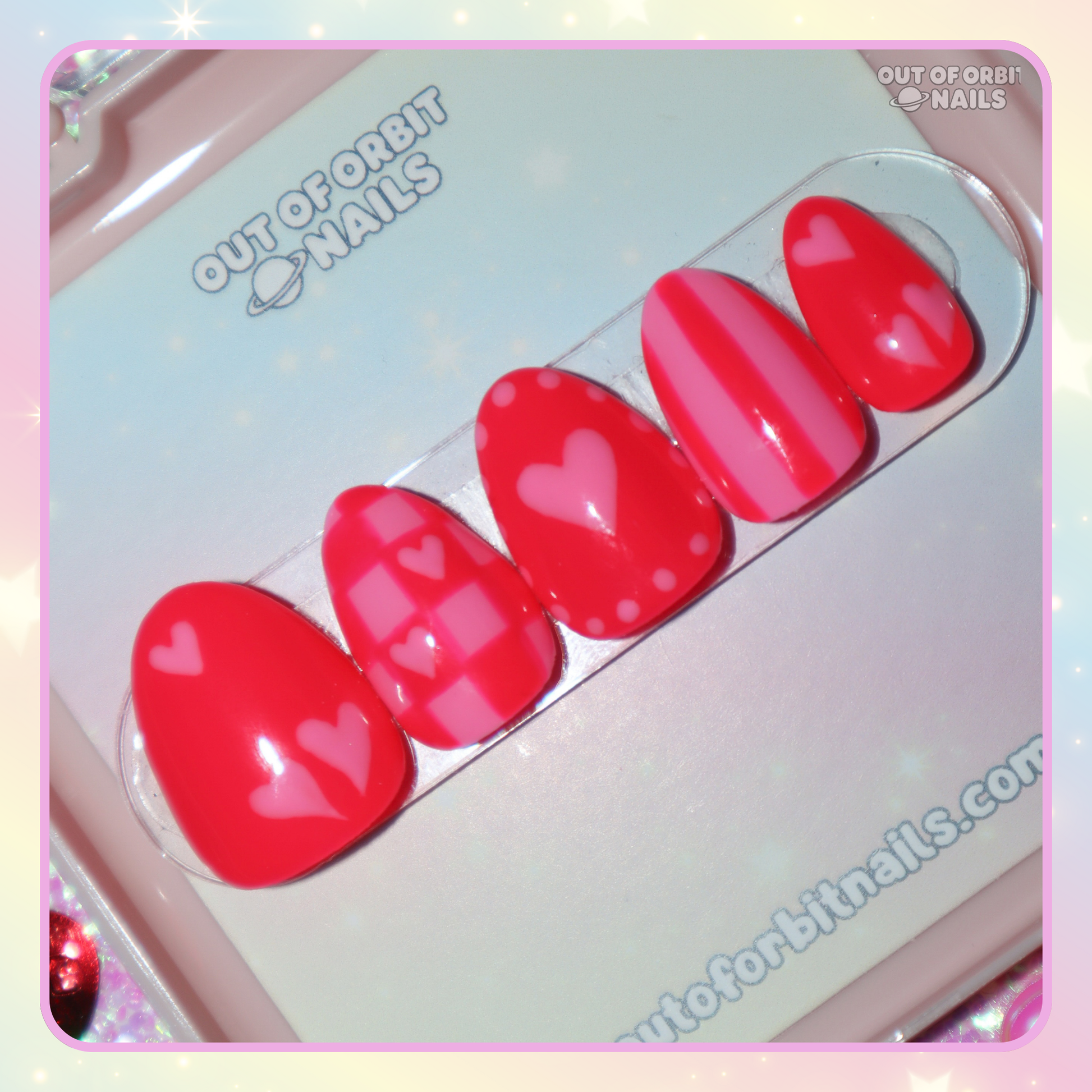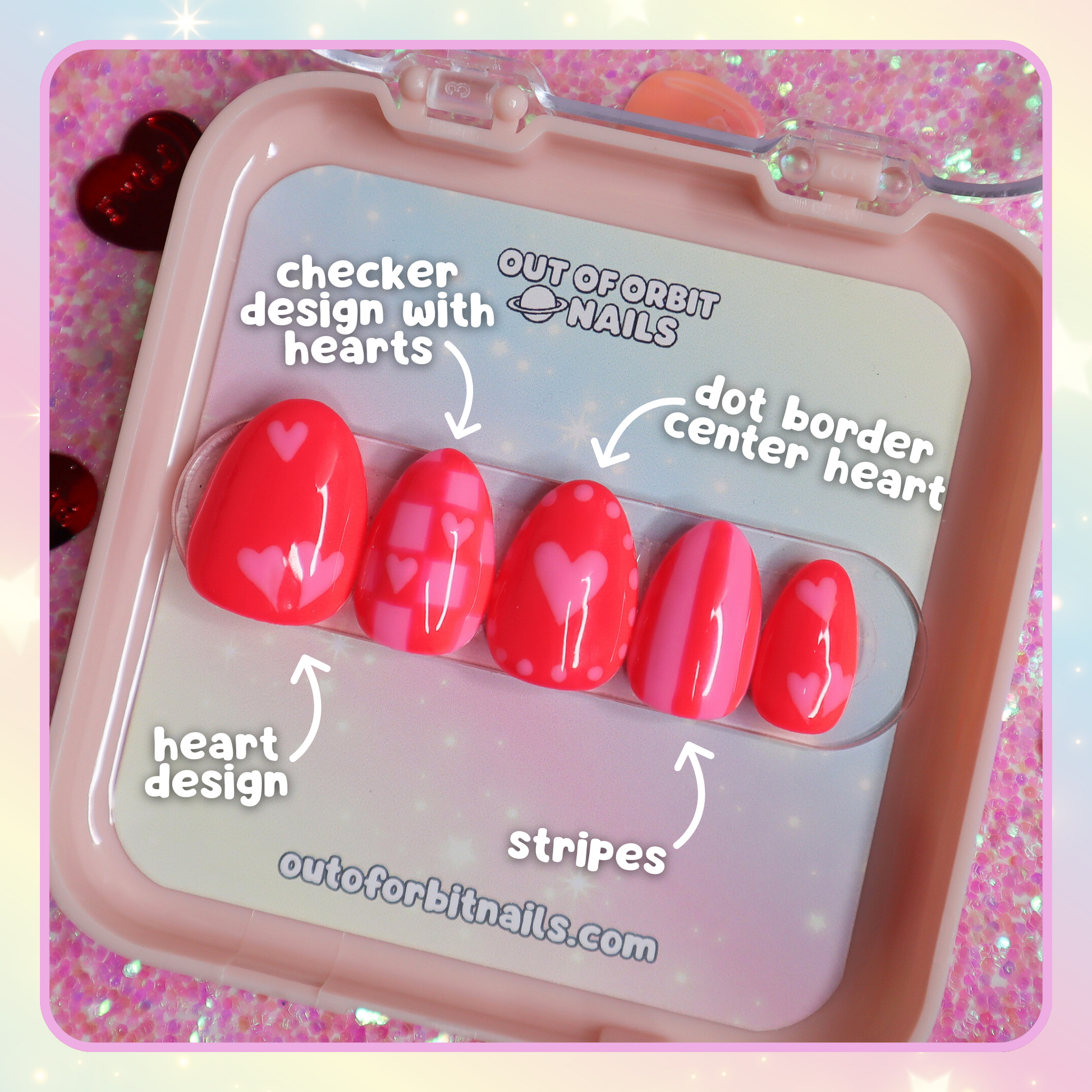 Design Features: Fully hand painted art design with different cute and trendy patterns with a Valentine’s Day twist! This has a duo color palette of bright neon coral red and bright bubblegum pink.