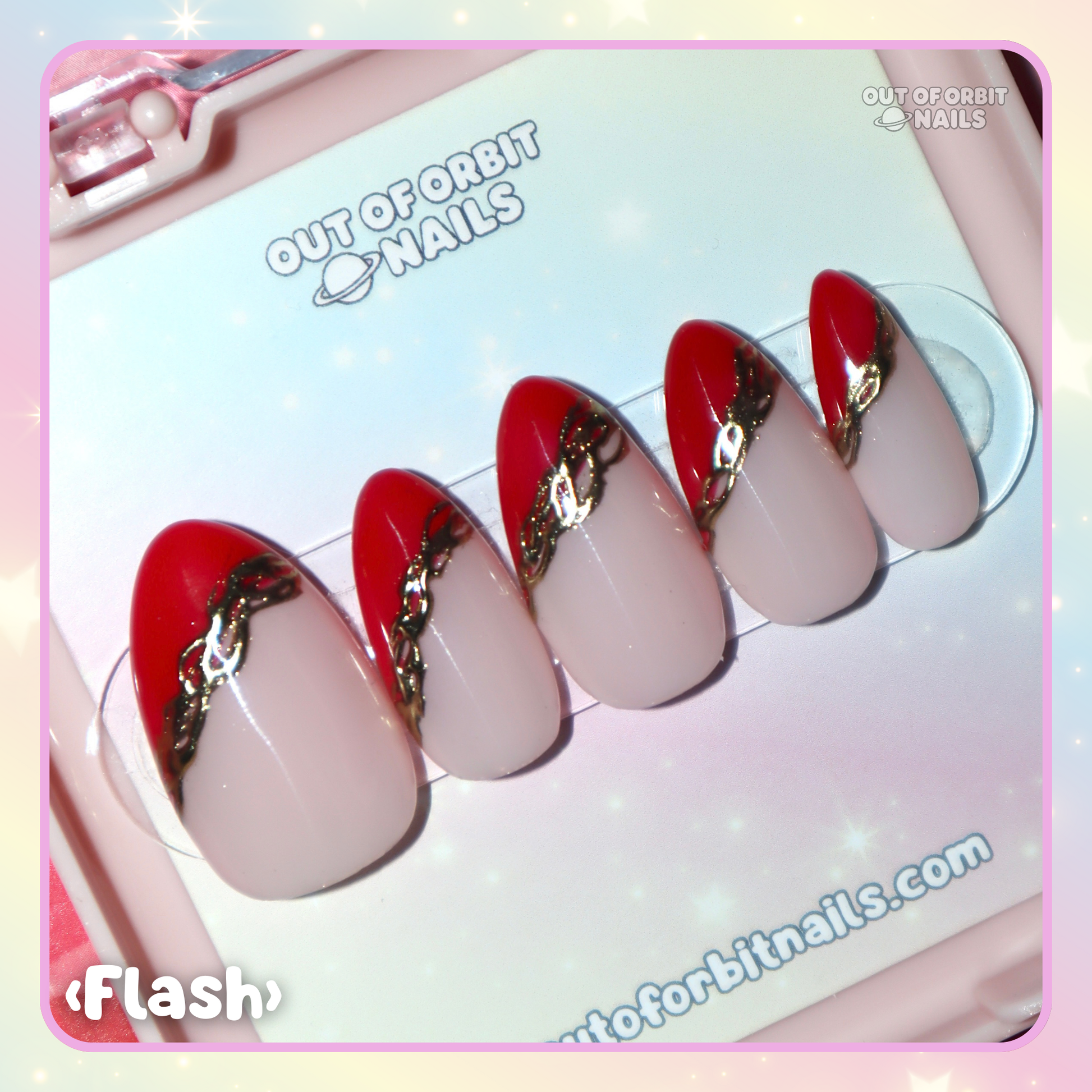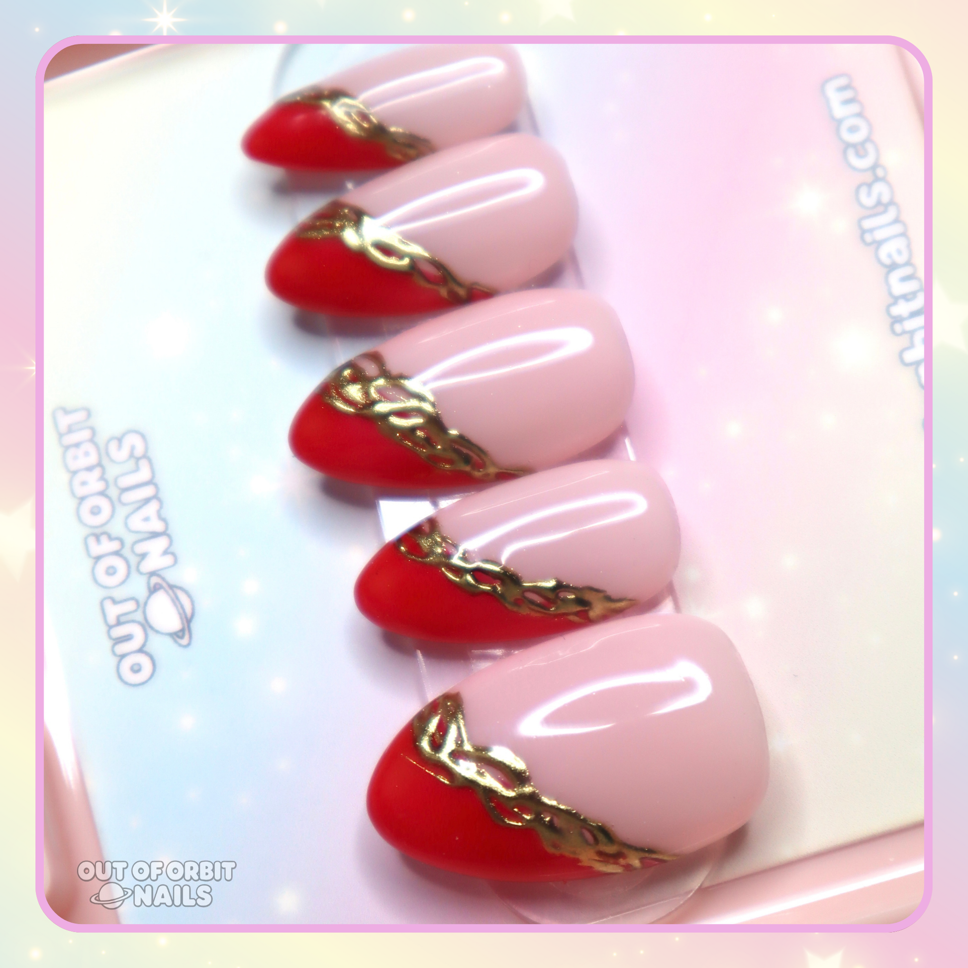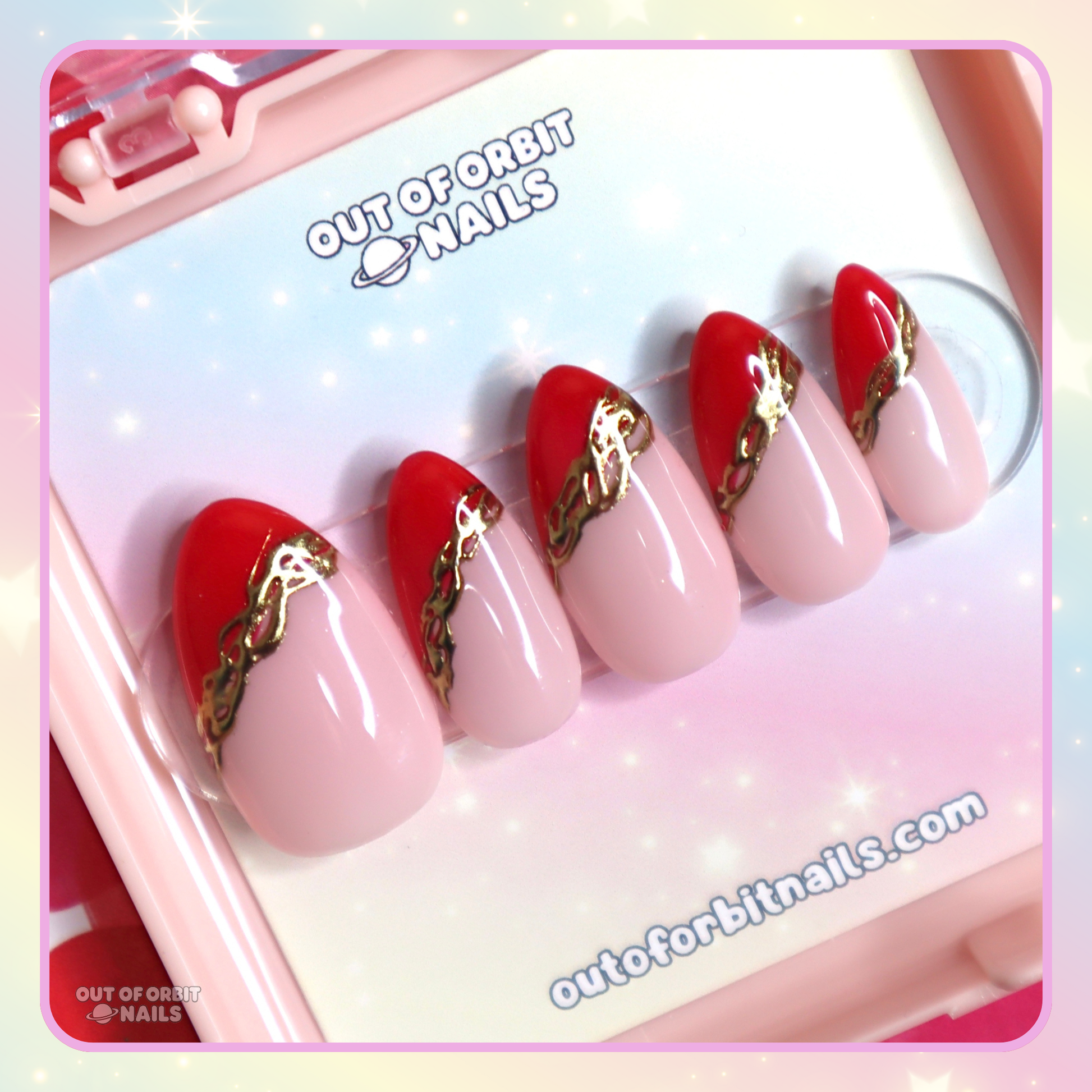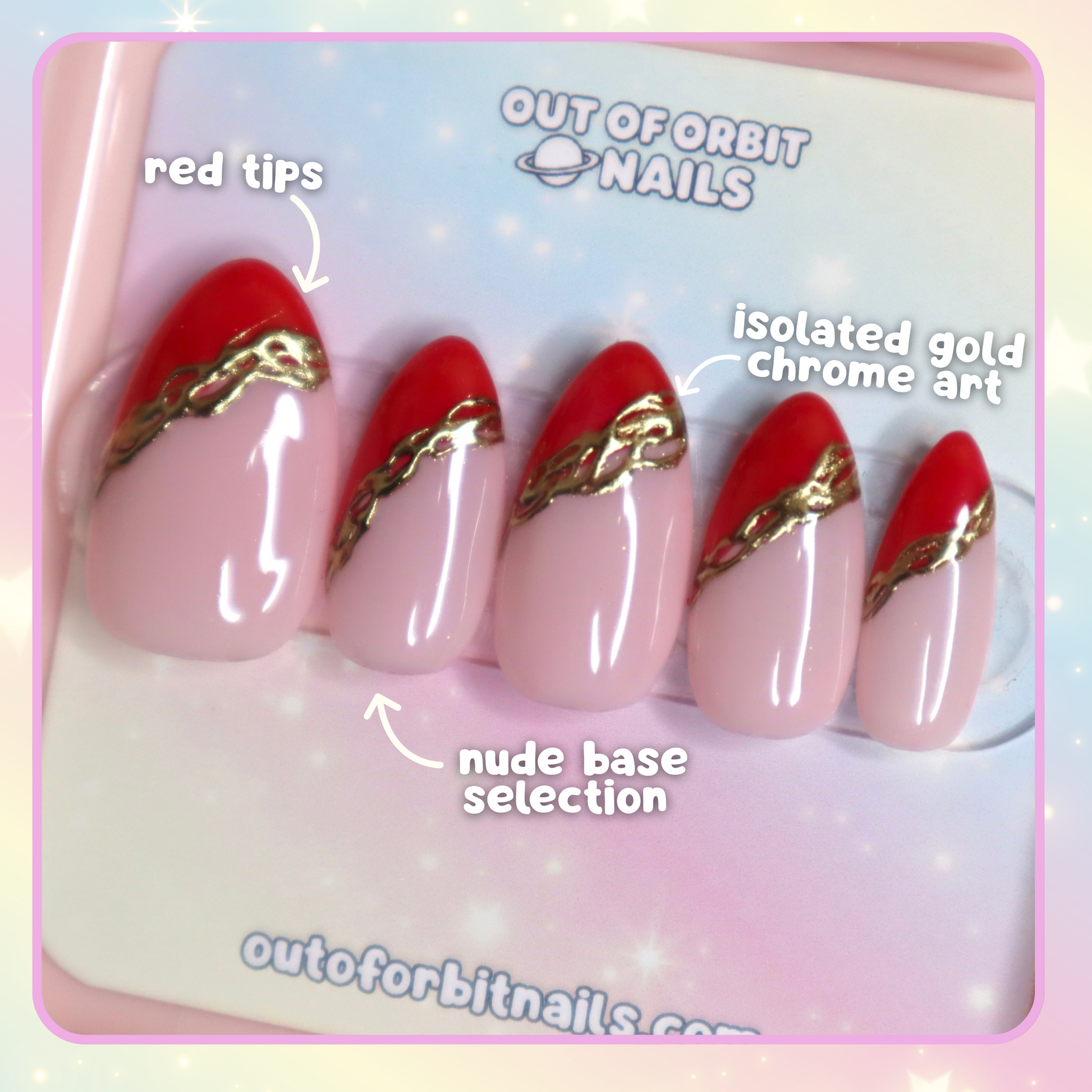 Design Features: Red abstract French tip design with molten gold isolated chrome paired with your selected base. This set comes with the option to select your preferred base shade. (Display features color base #8)