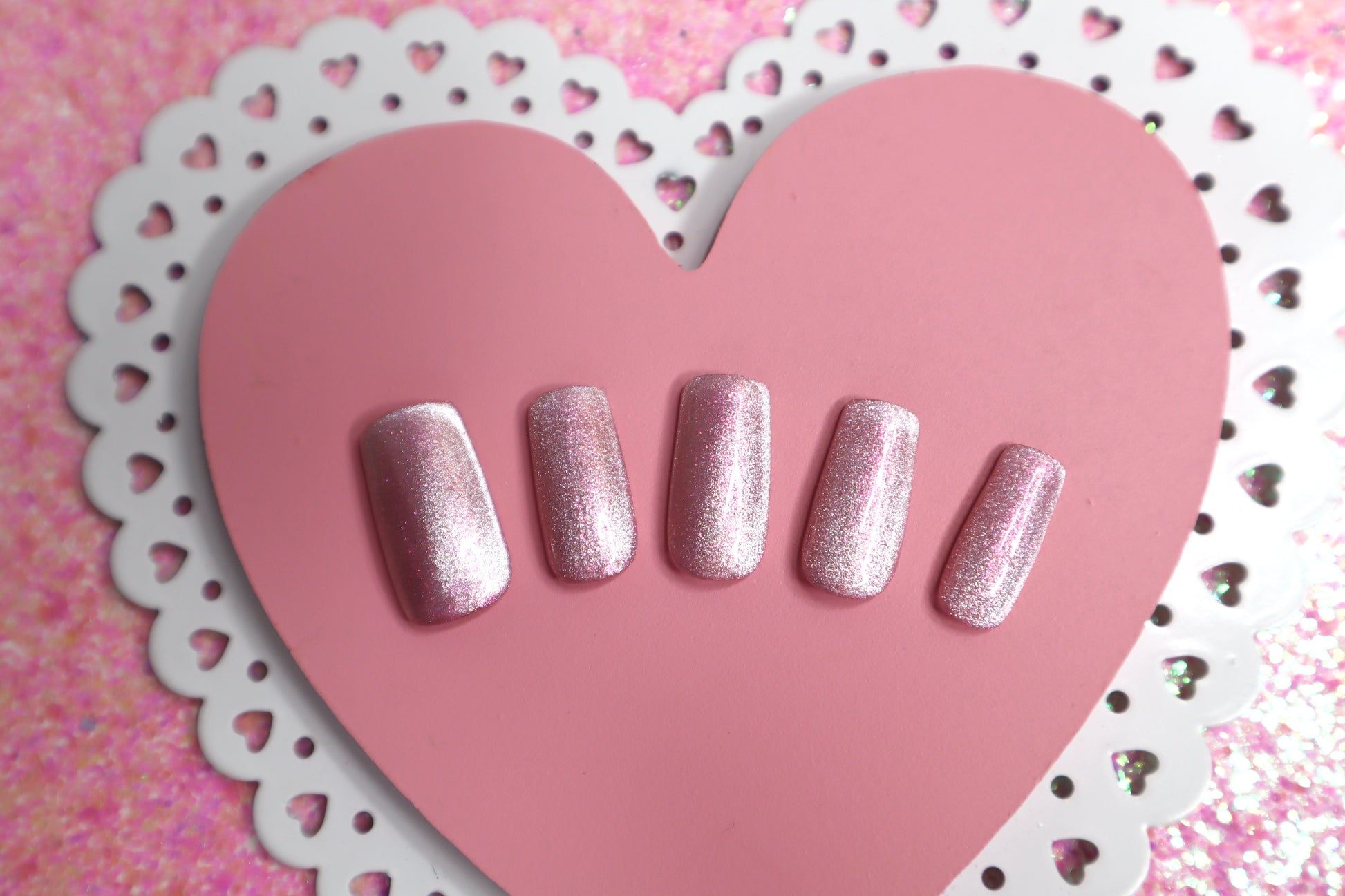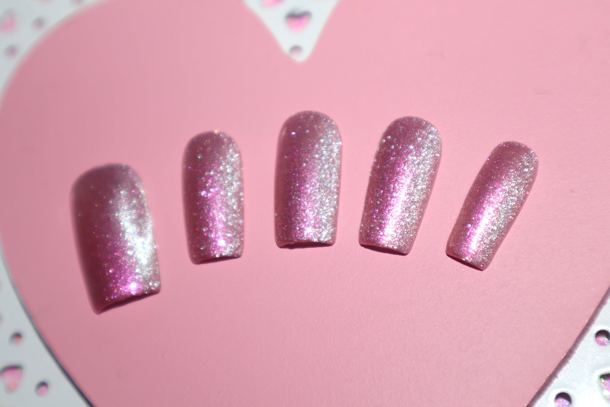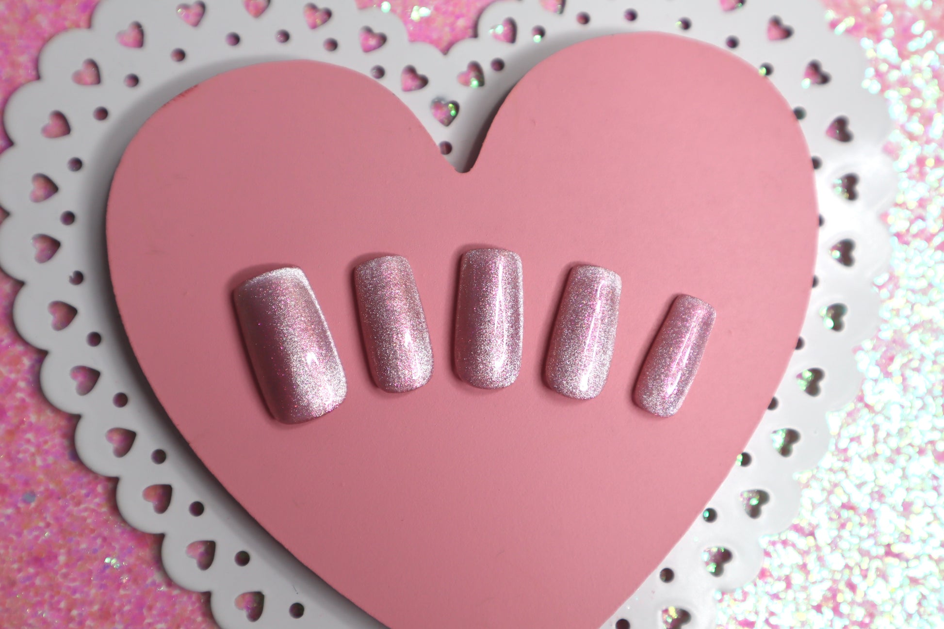 Design Features: Solid cat eye design that has silvery pink glitter particles. This set looks great in all different types of lighting (especially sunlight) and the cat eye will "dance" & shift when moving your hands!