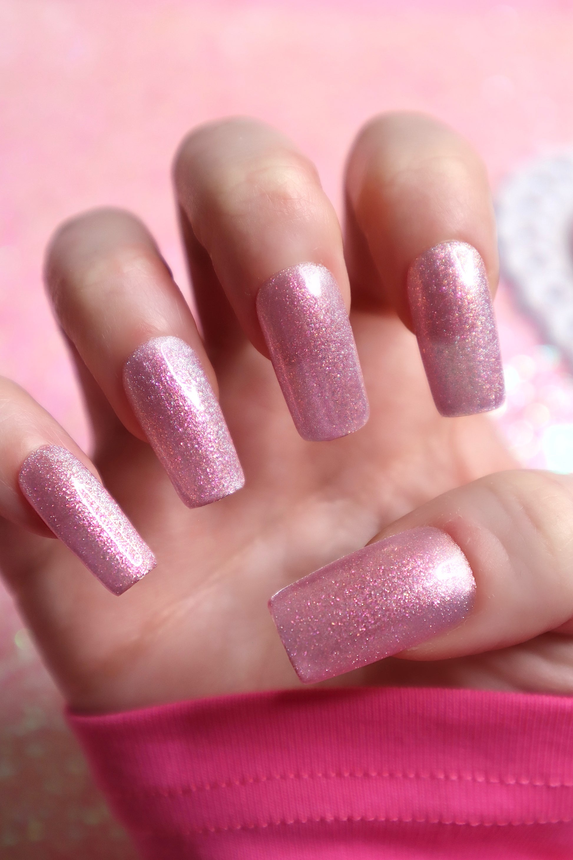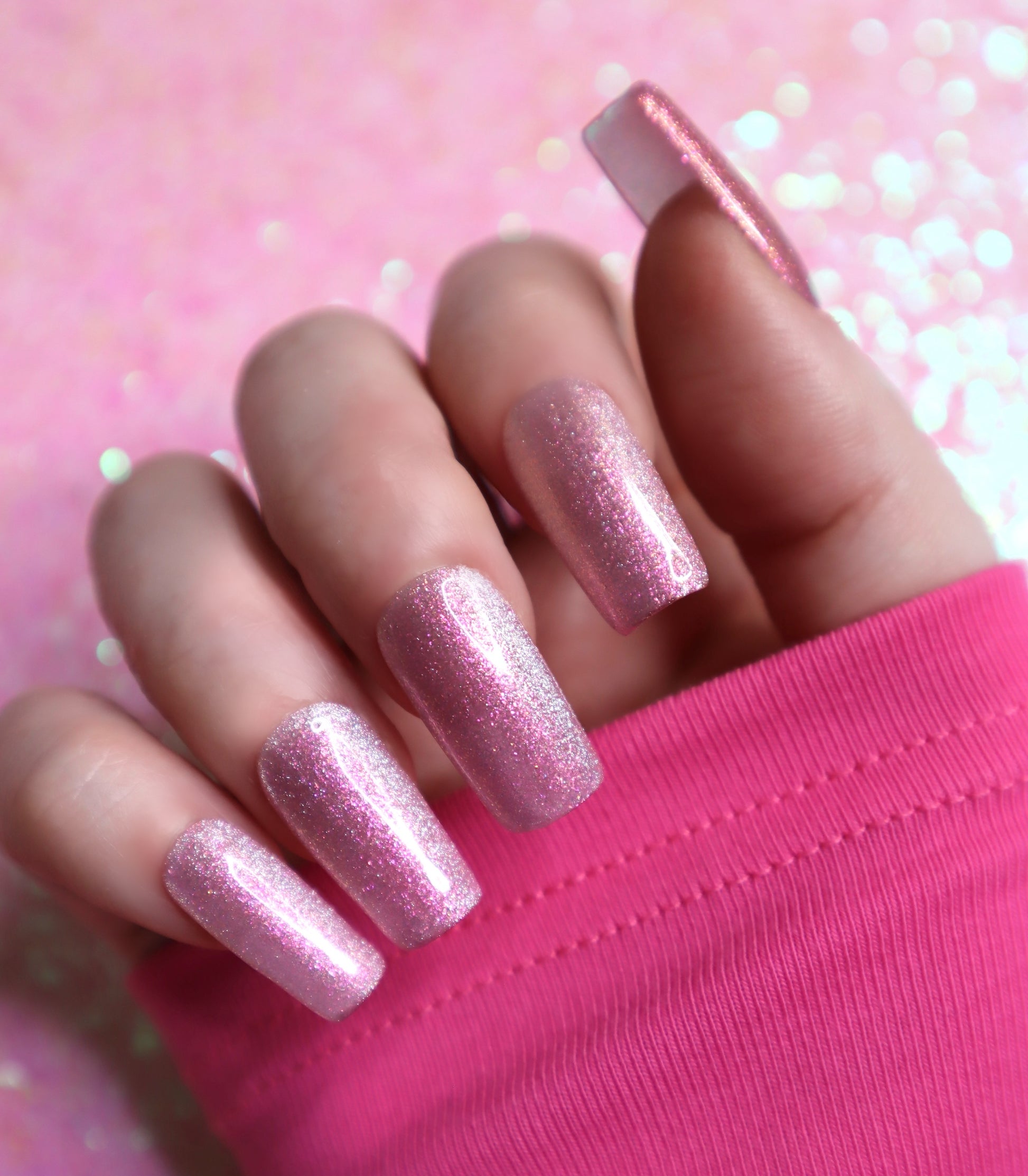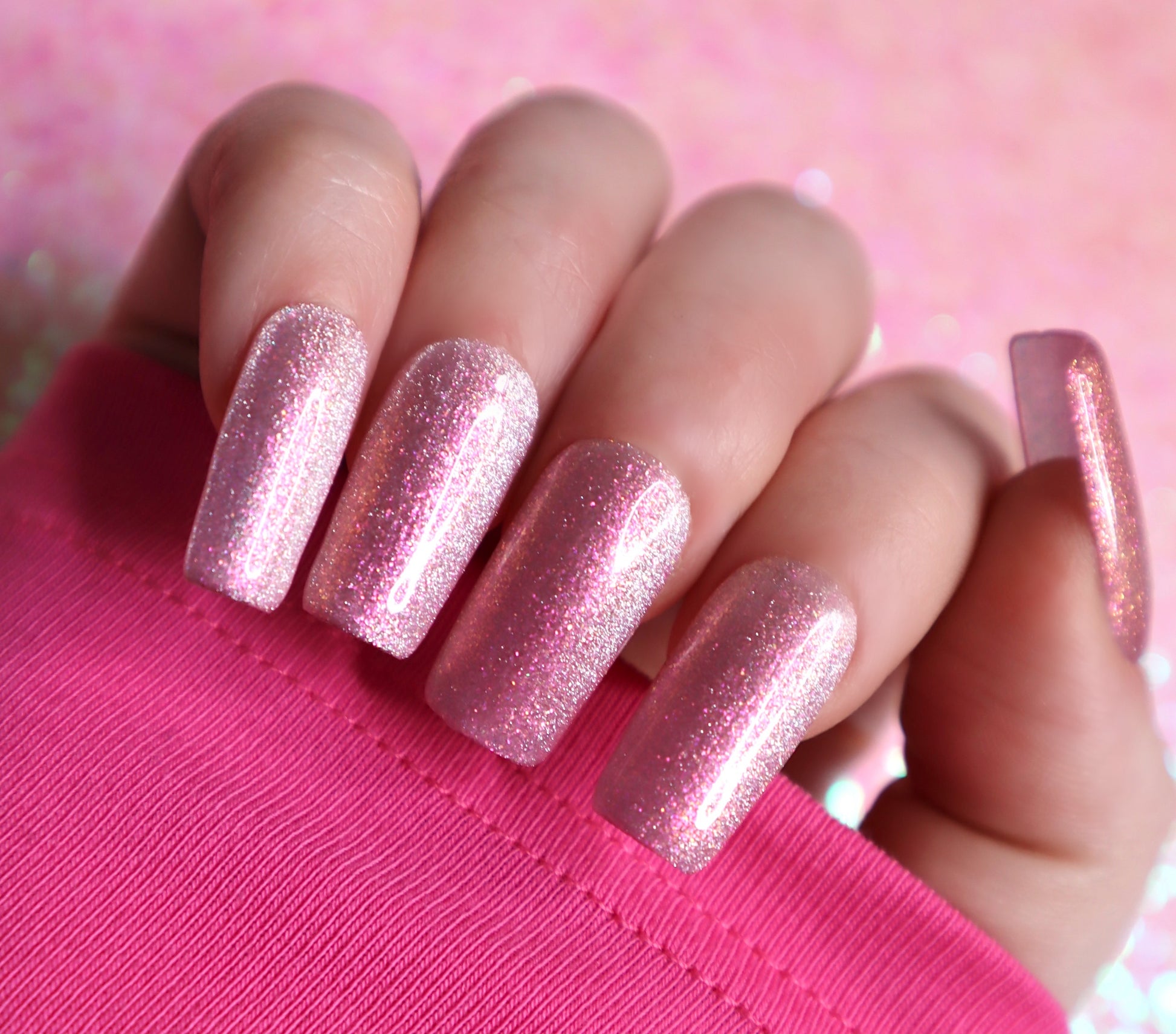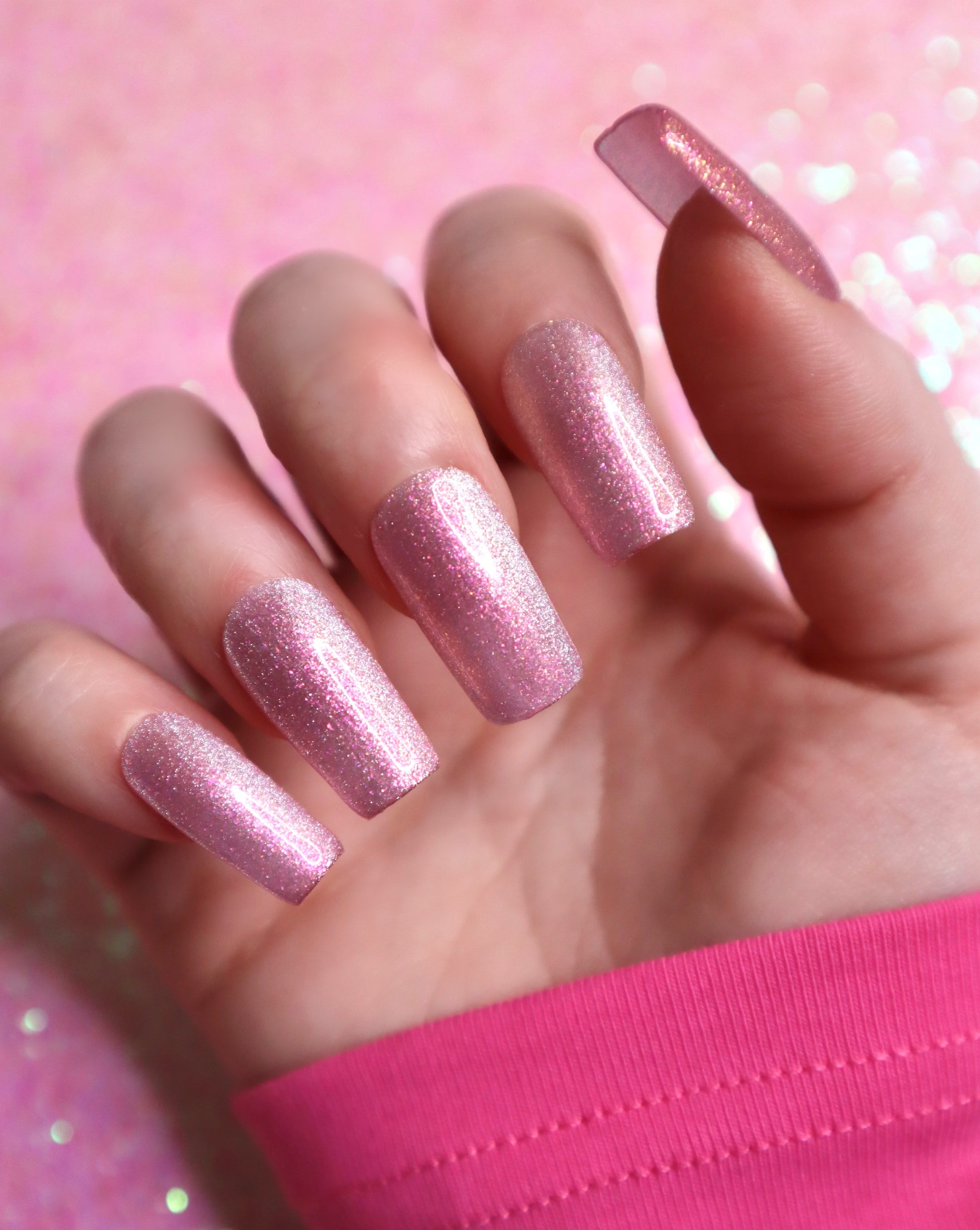 Design Features: Solid cat eye design that has silvery pink glitter particles. This set looks great in all different types of lighting (especially sunlight) and the cat eye will "dance" & shift when moving your hands!