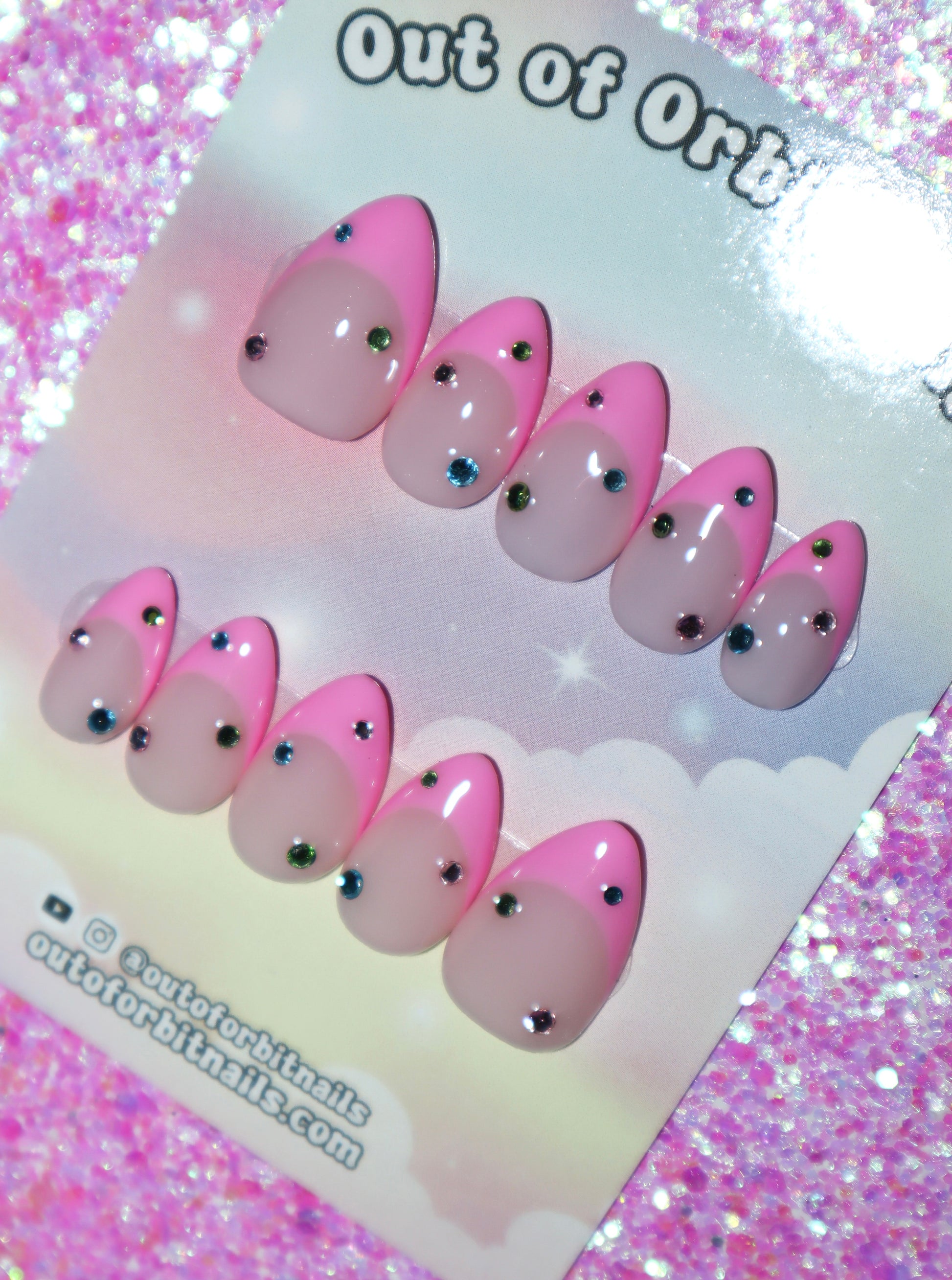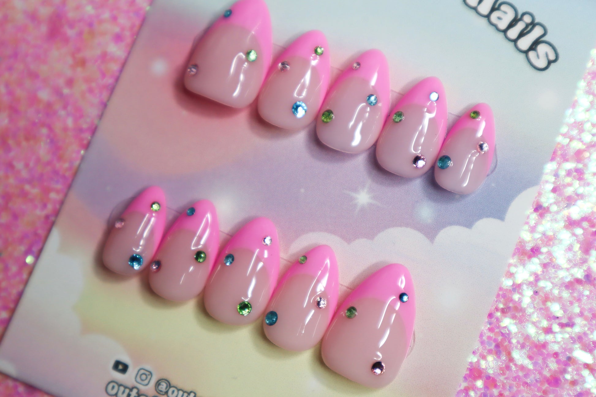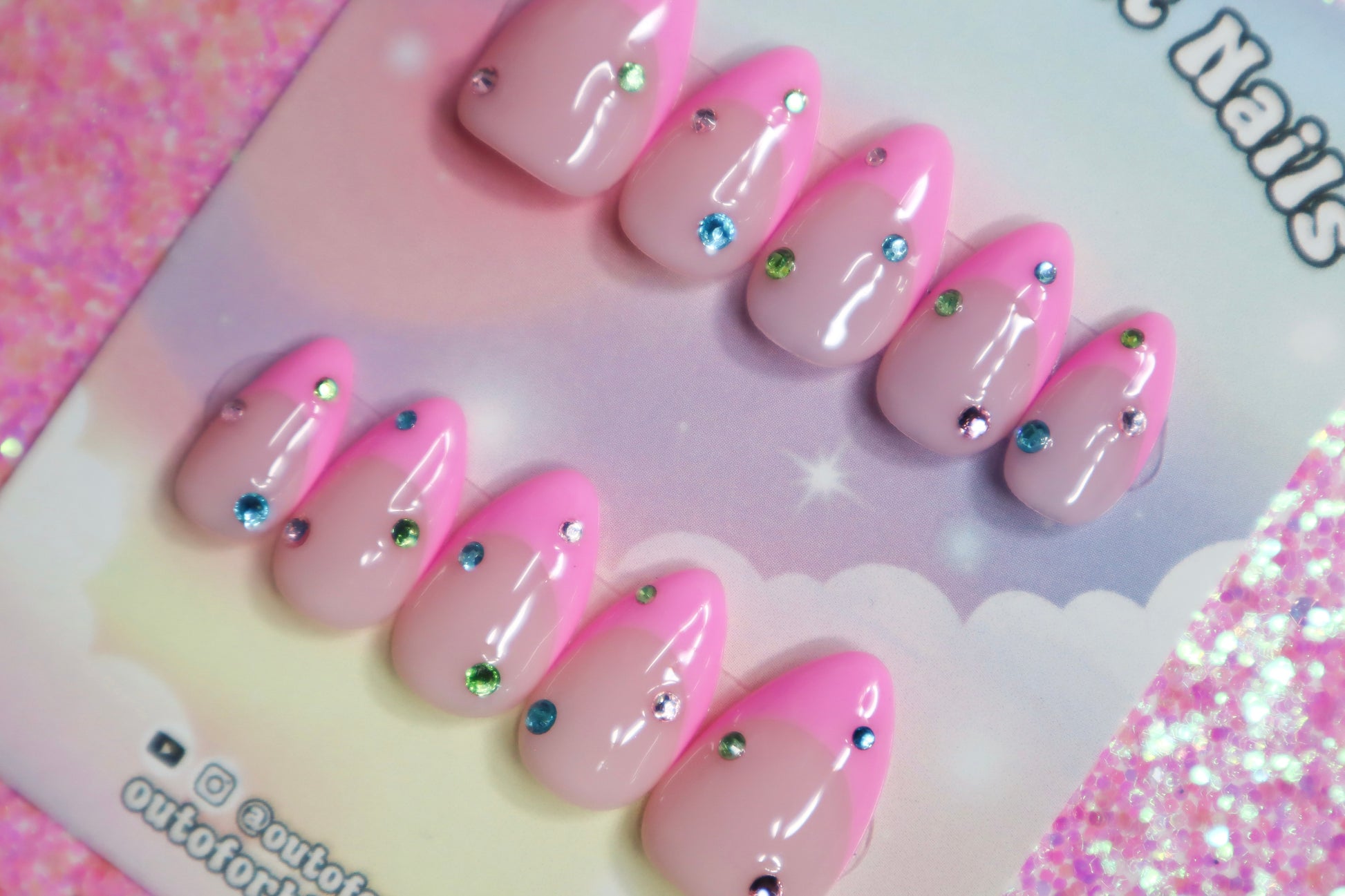 Design Features: Full french tip design with blue, green, & pink rhinestone pattern of different sizes on each nail.