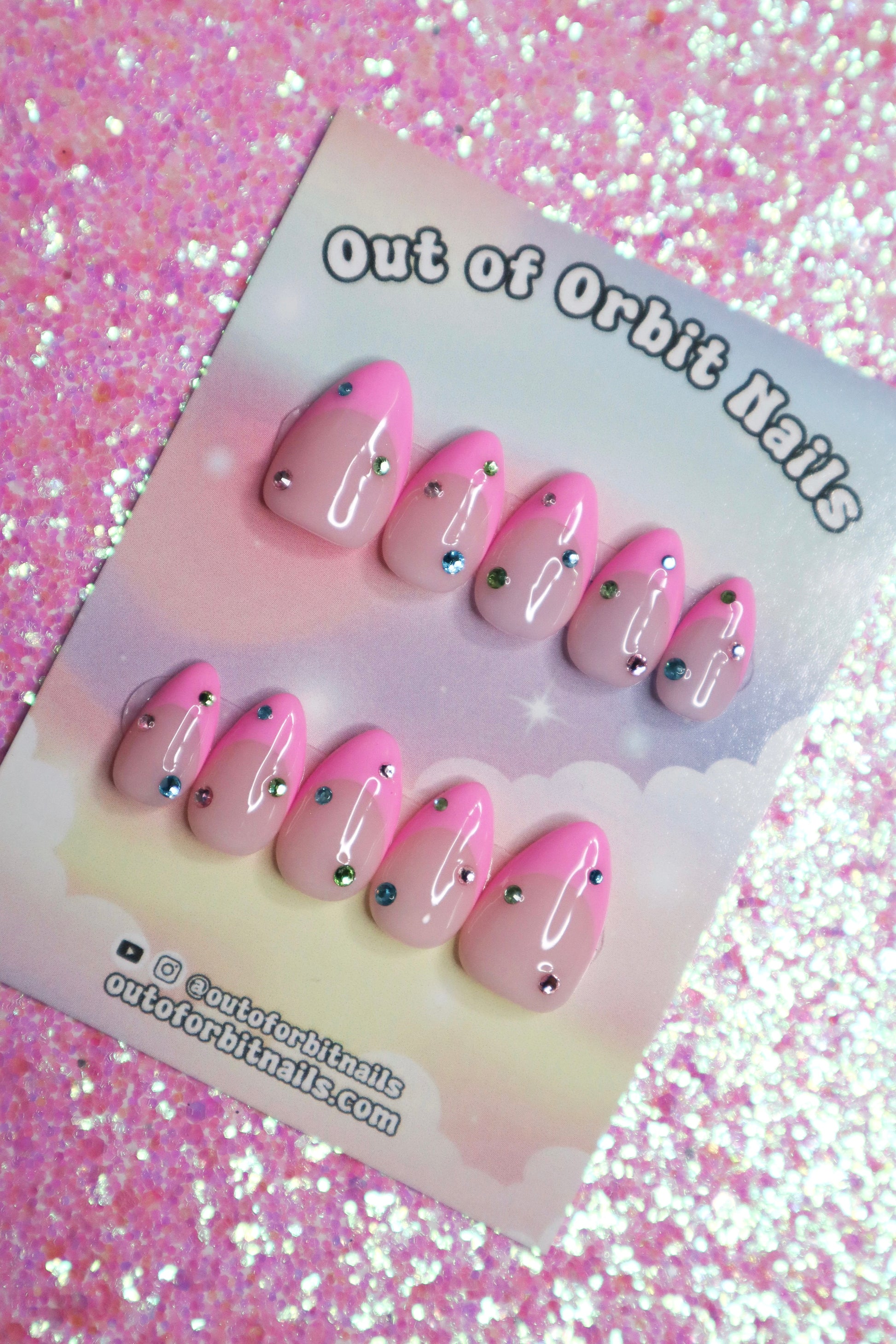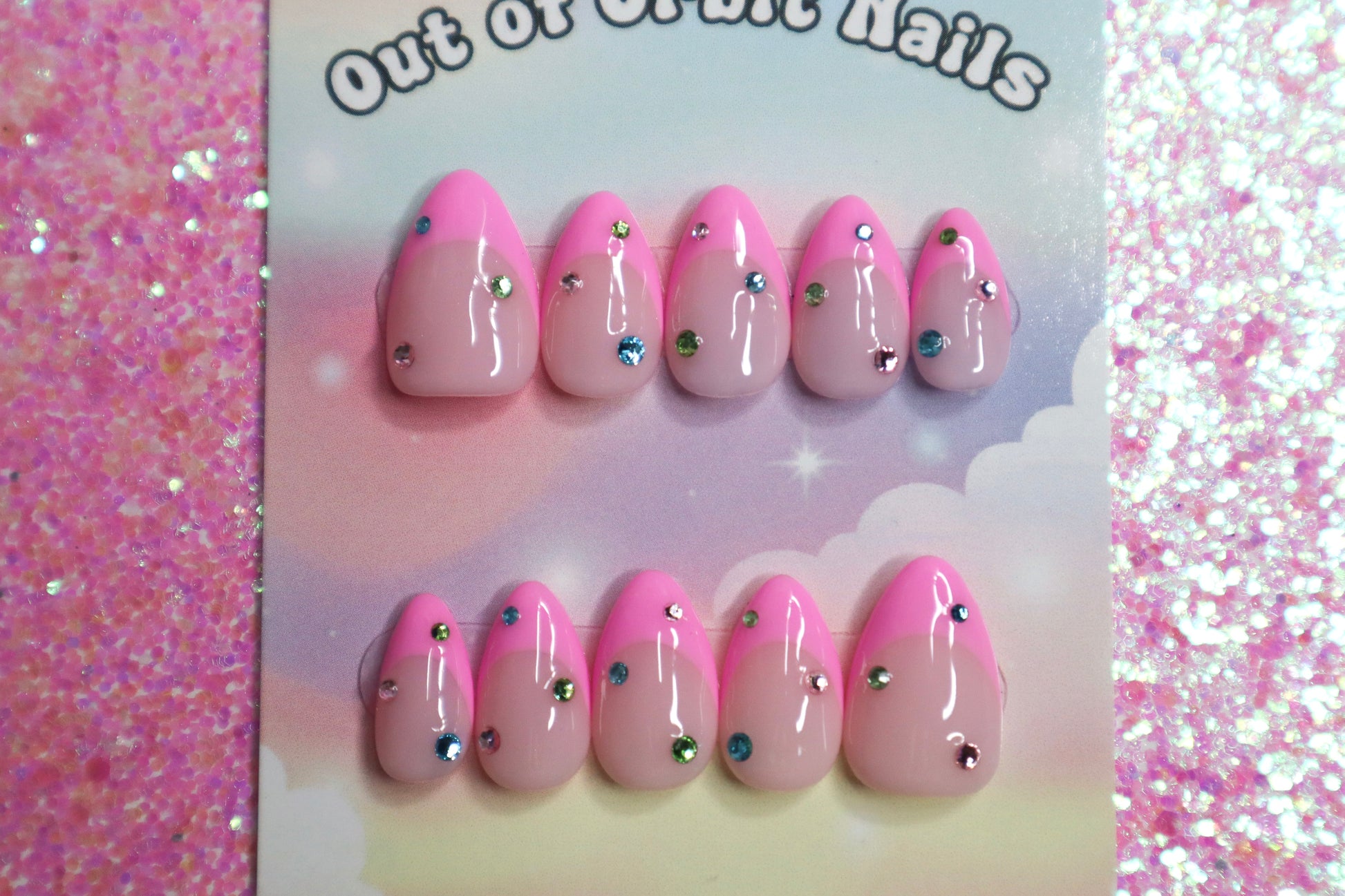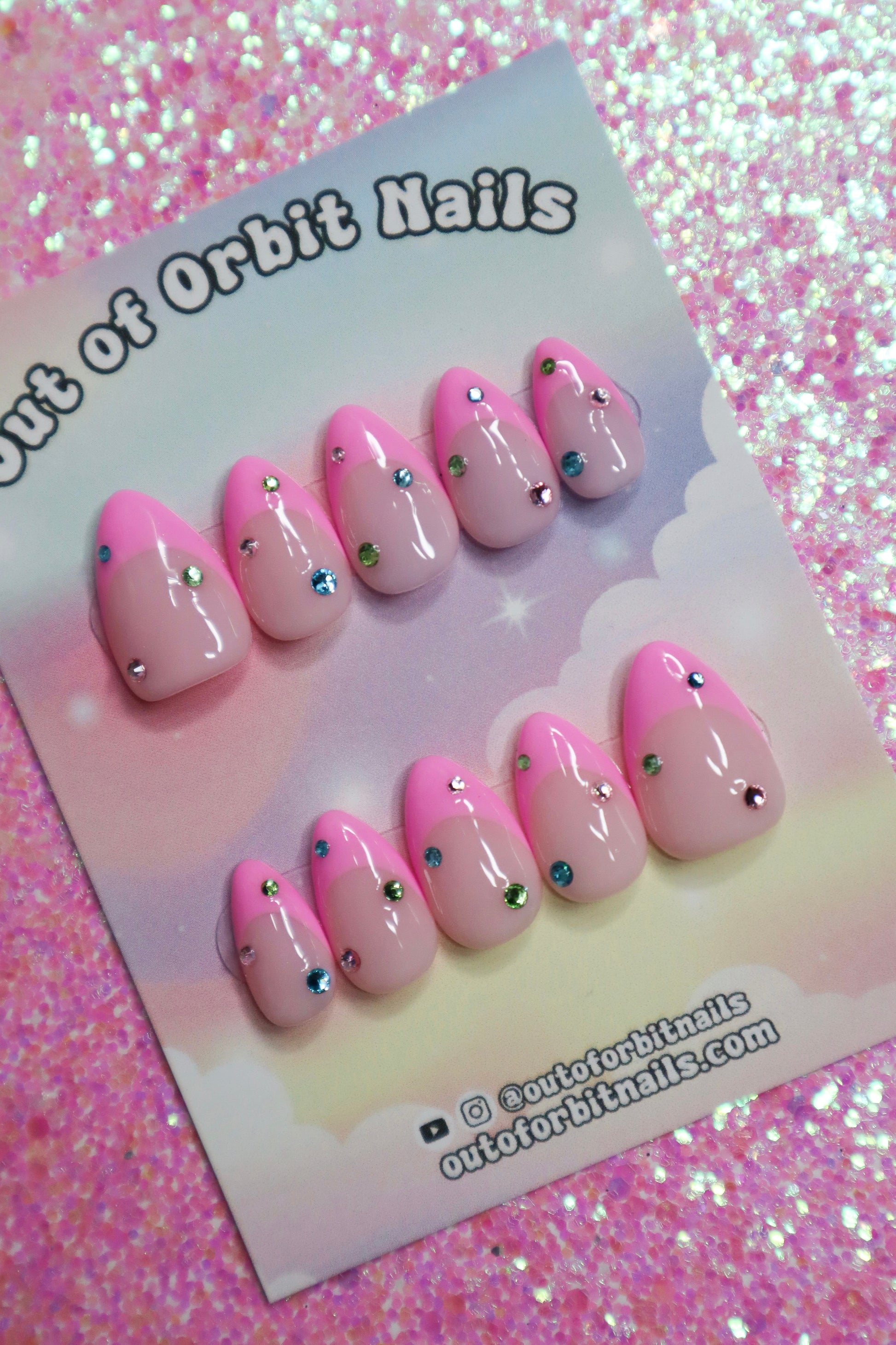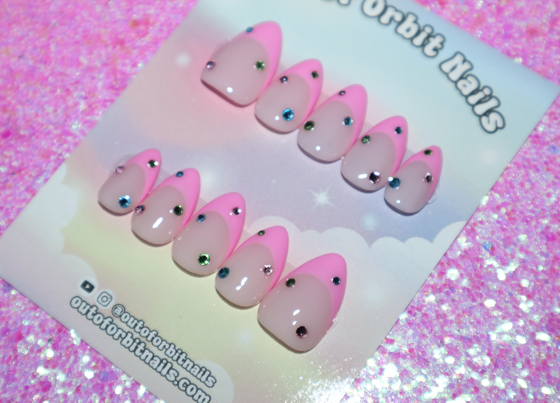 Design Features: Full french tip design with blue, green, & pink rhinestone pattern of different sizes on each nail.