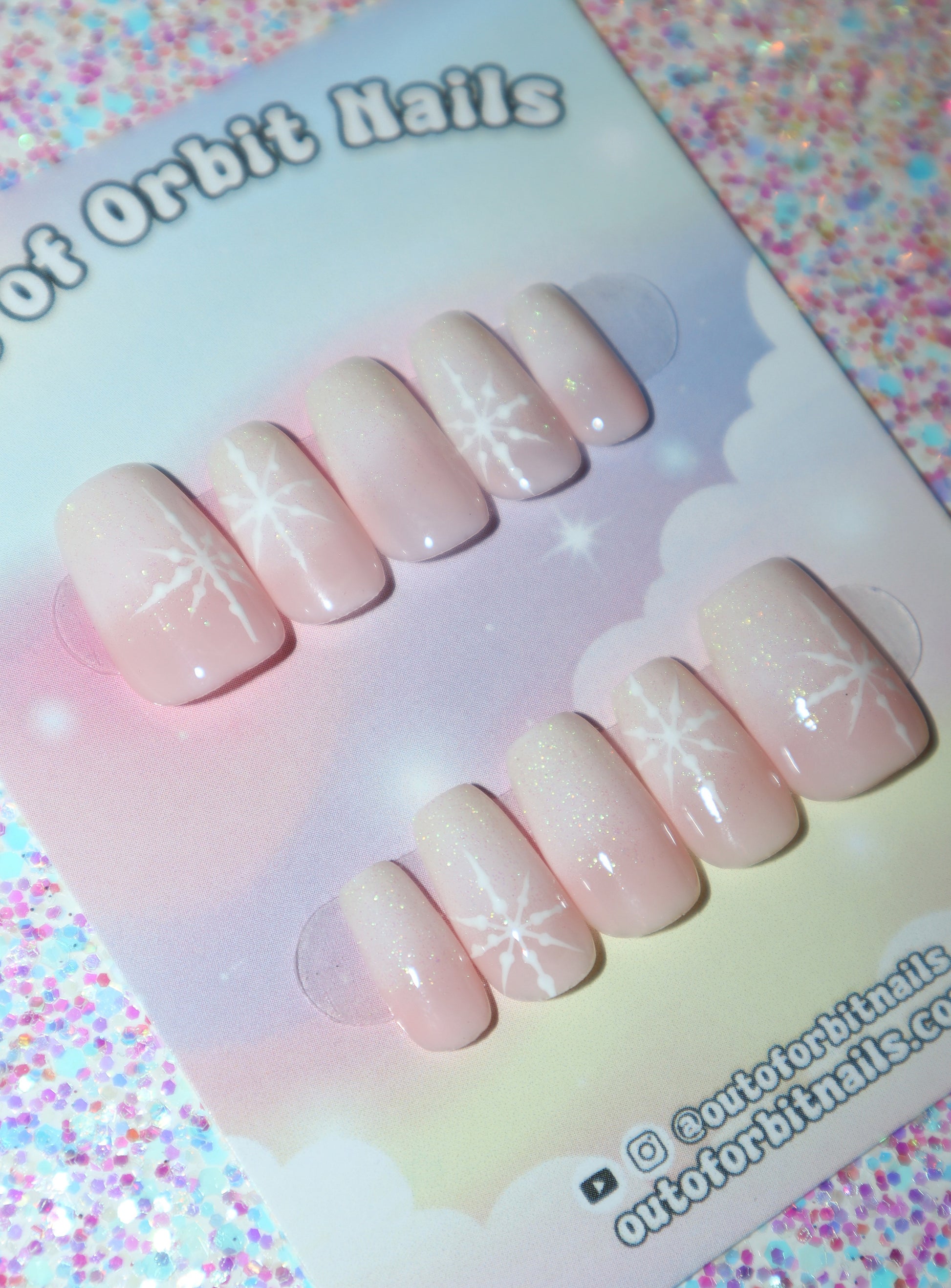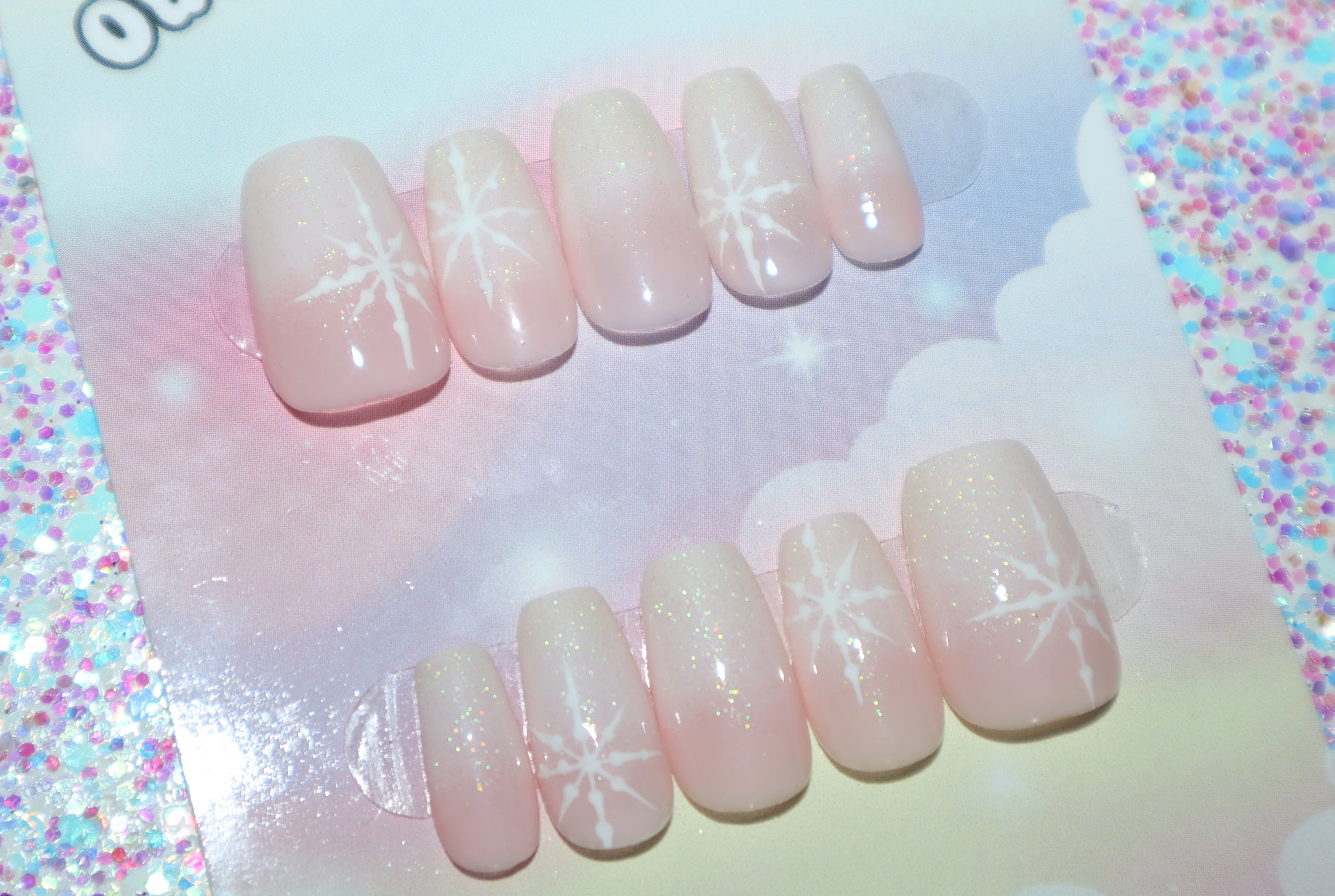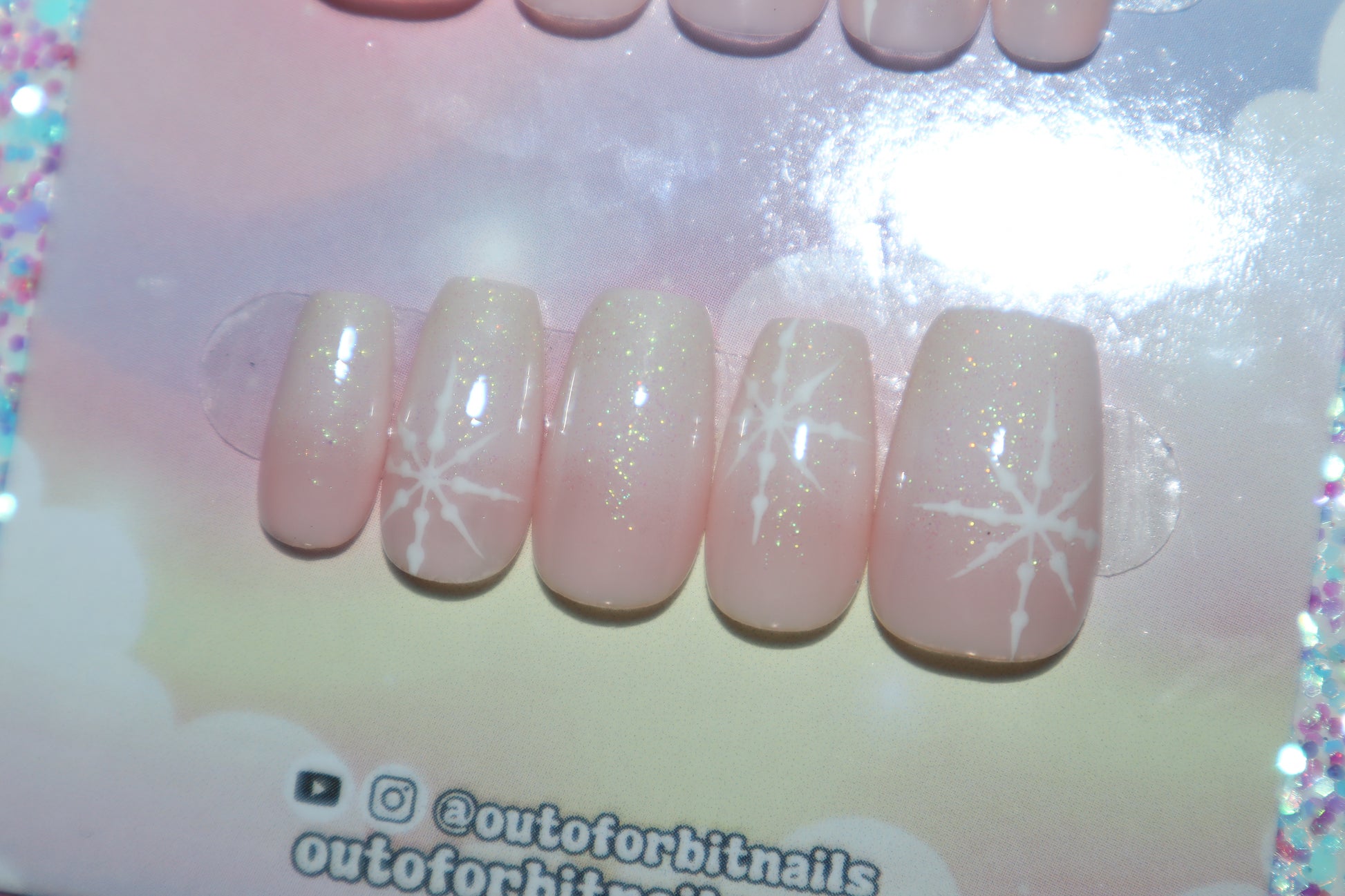 Design Features: Hand patted pink and white ombre design topped with iridescent glitter gel and hand painted snowflakes.