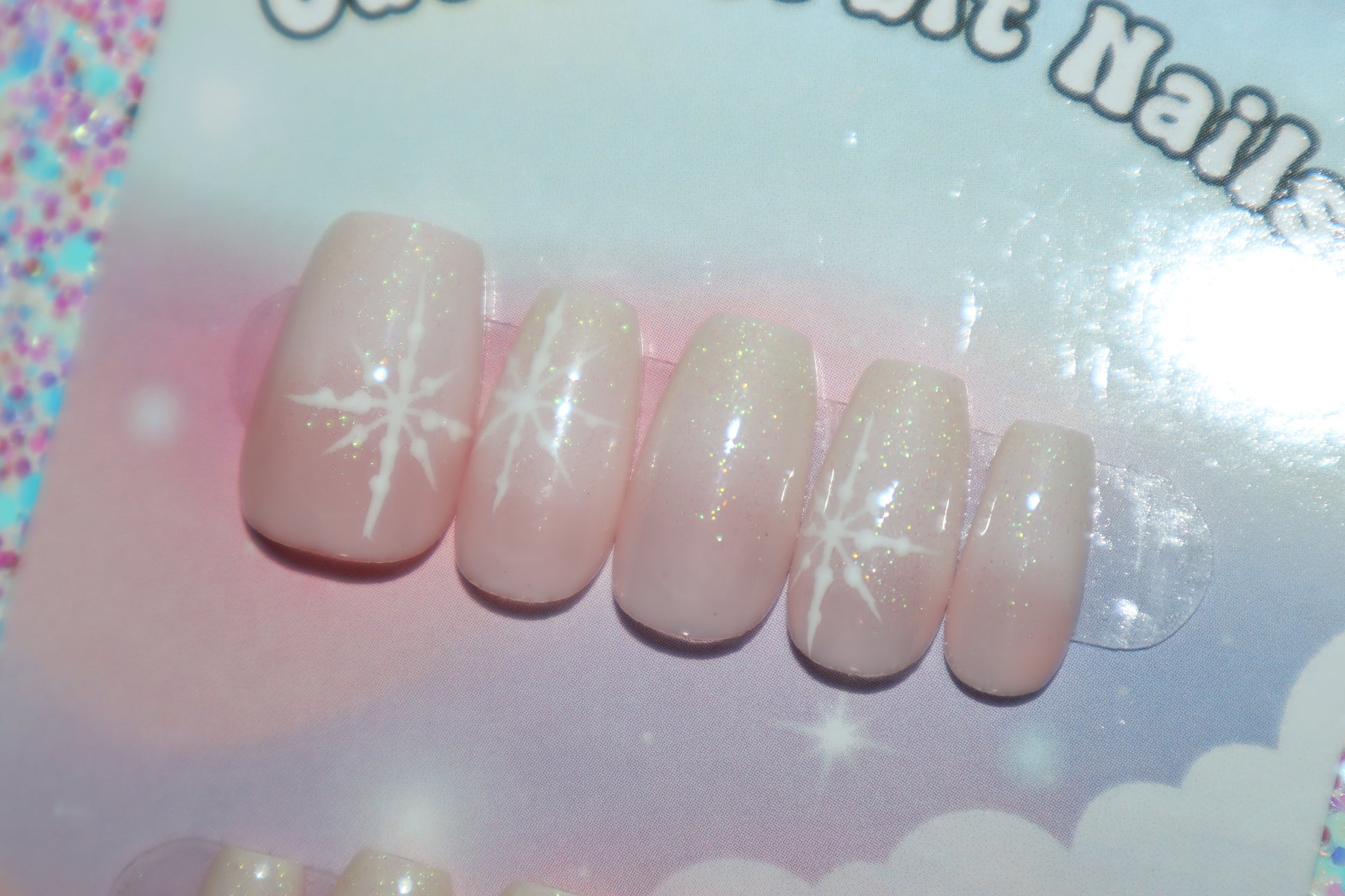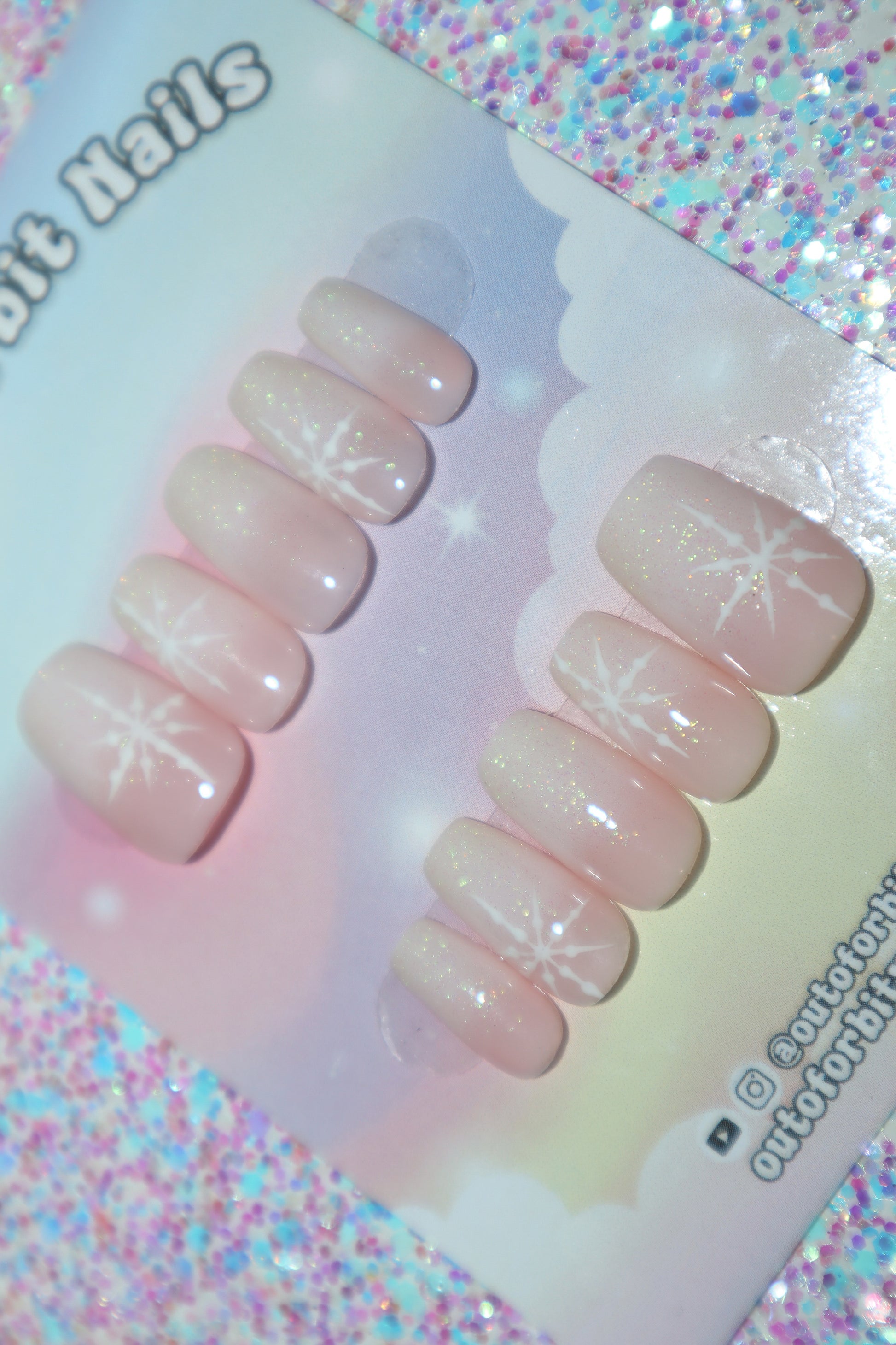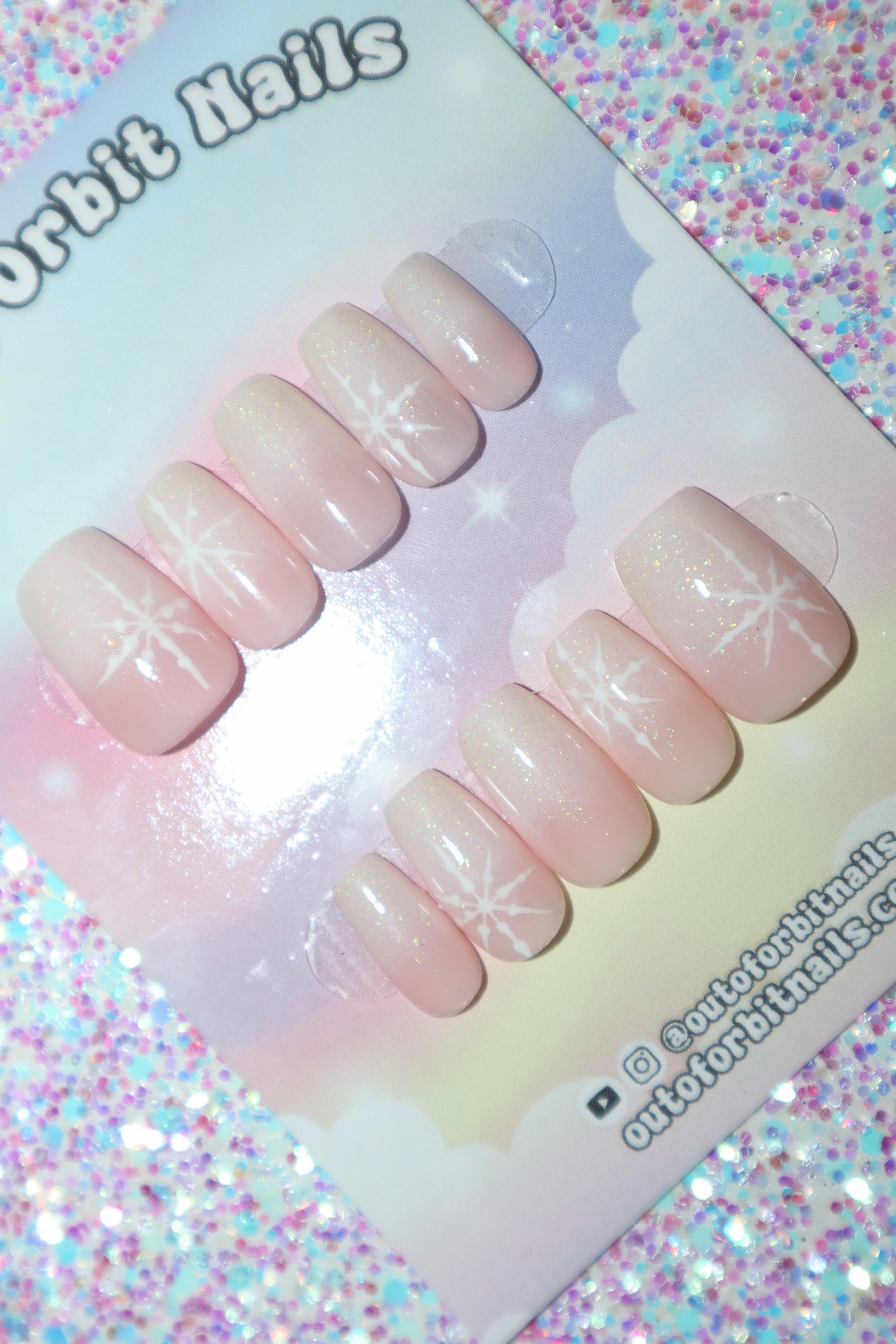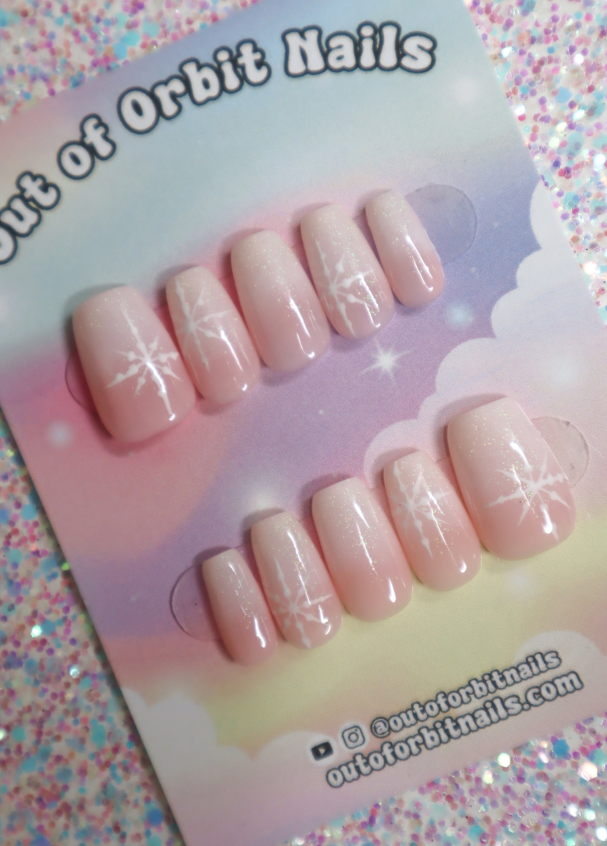 Design Features: Hand patted pink and white ombre design topped with iridescent glitter gel and hand painted snowflakes.