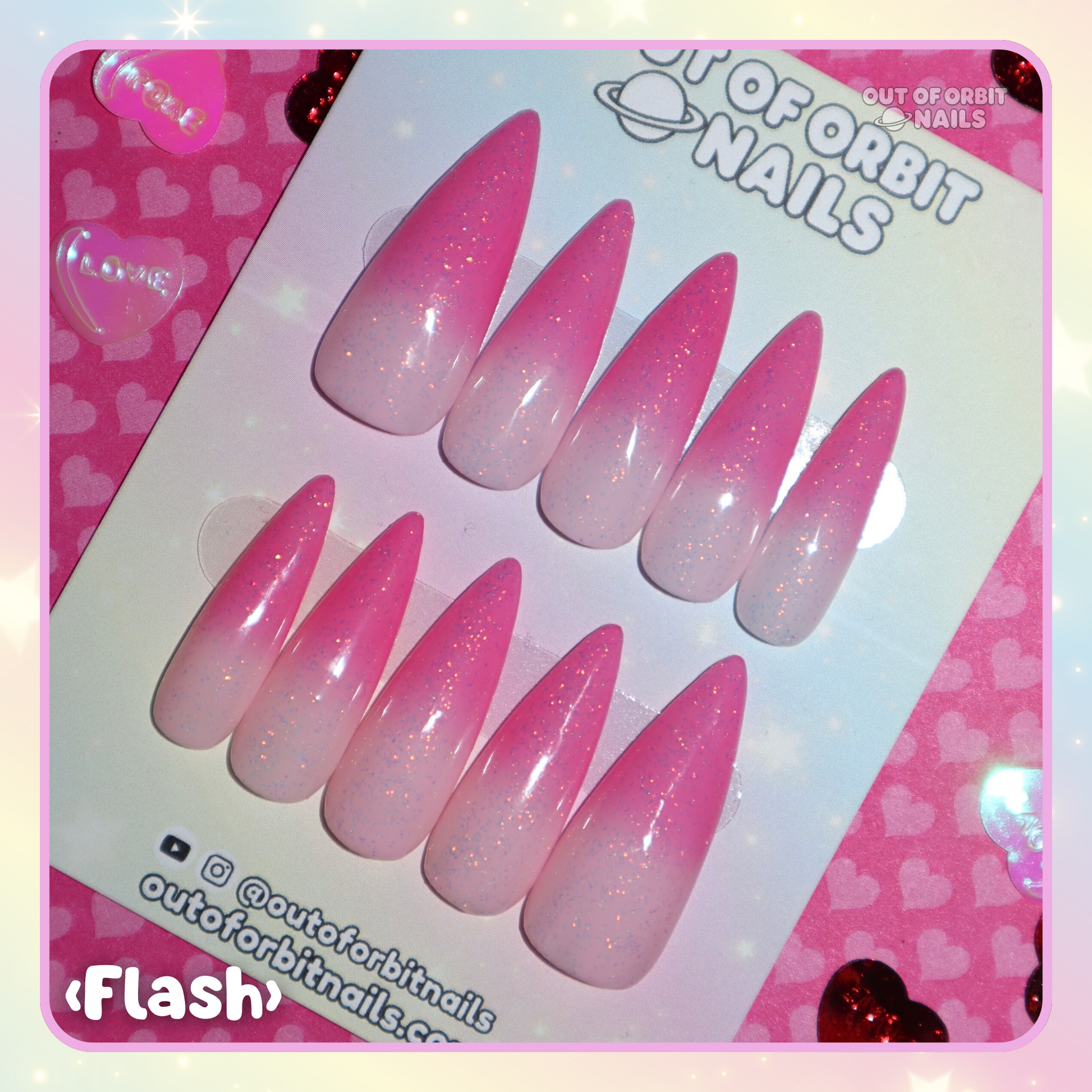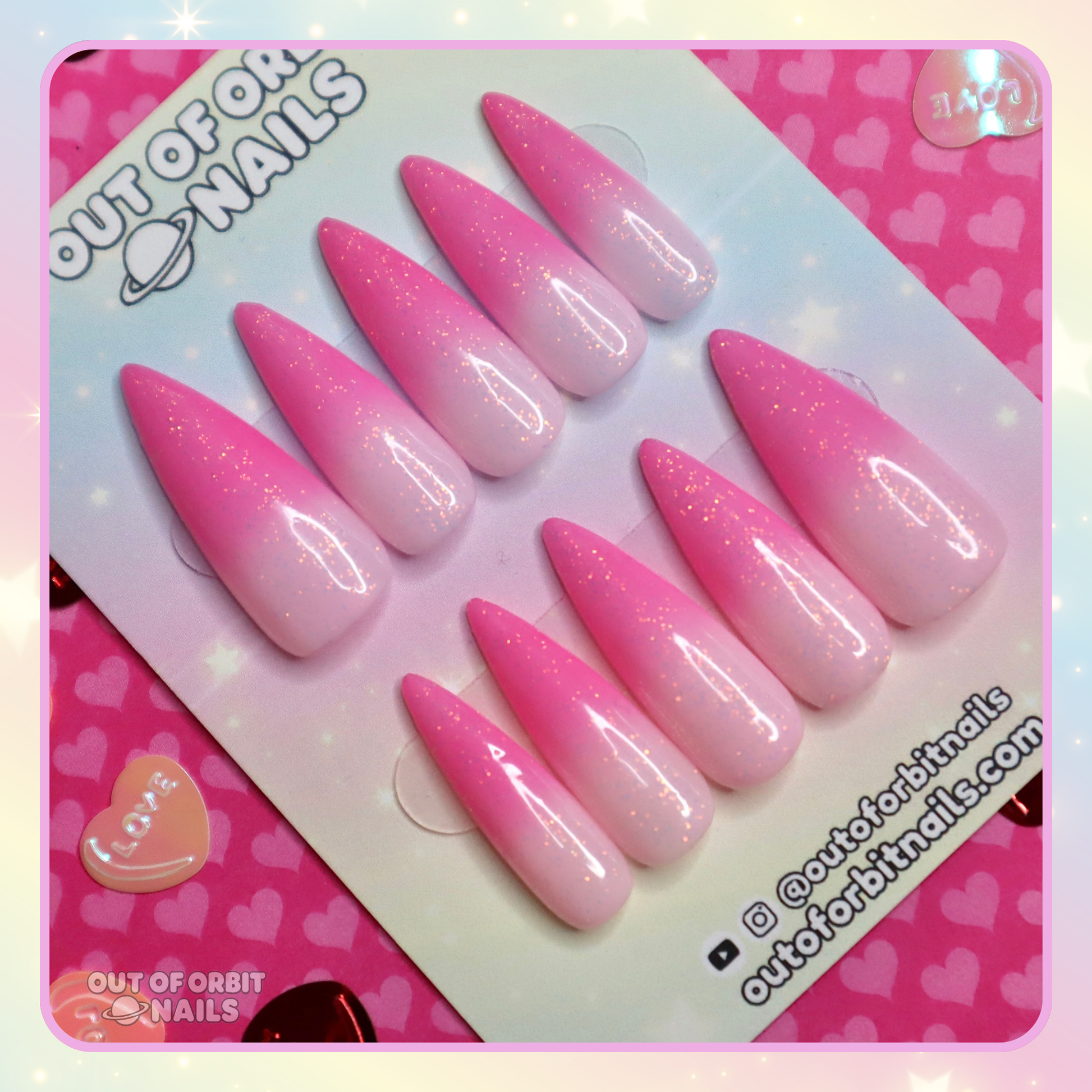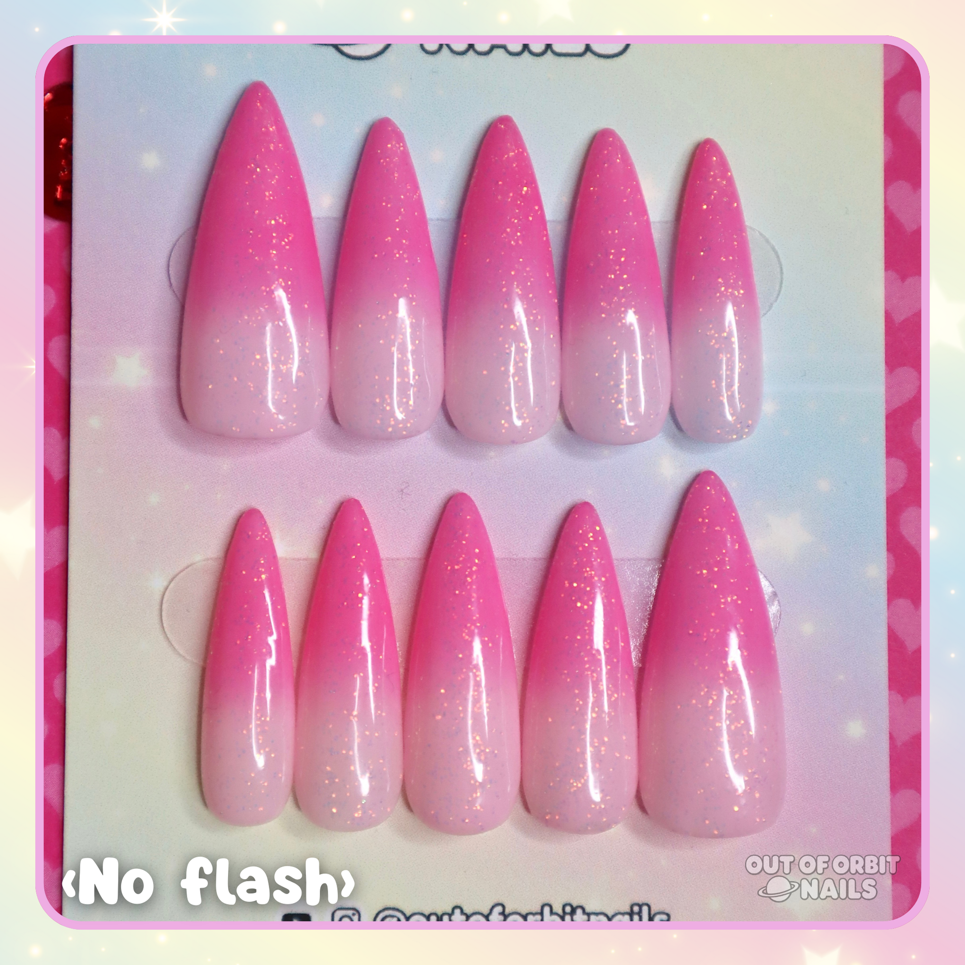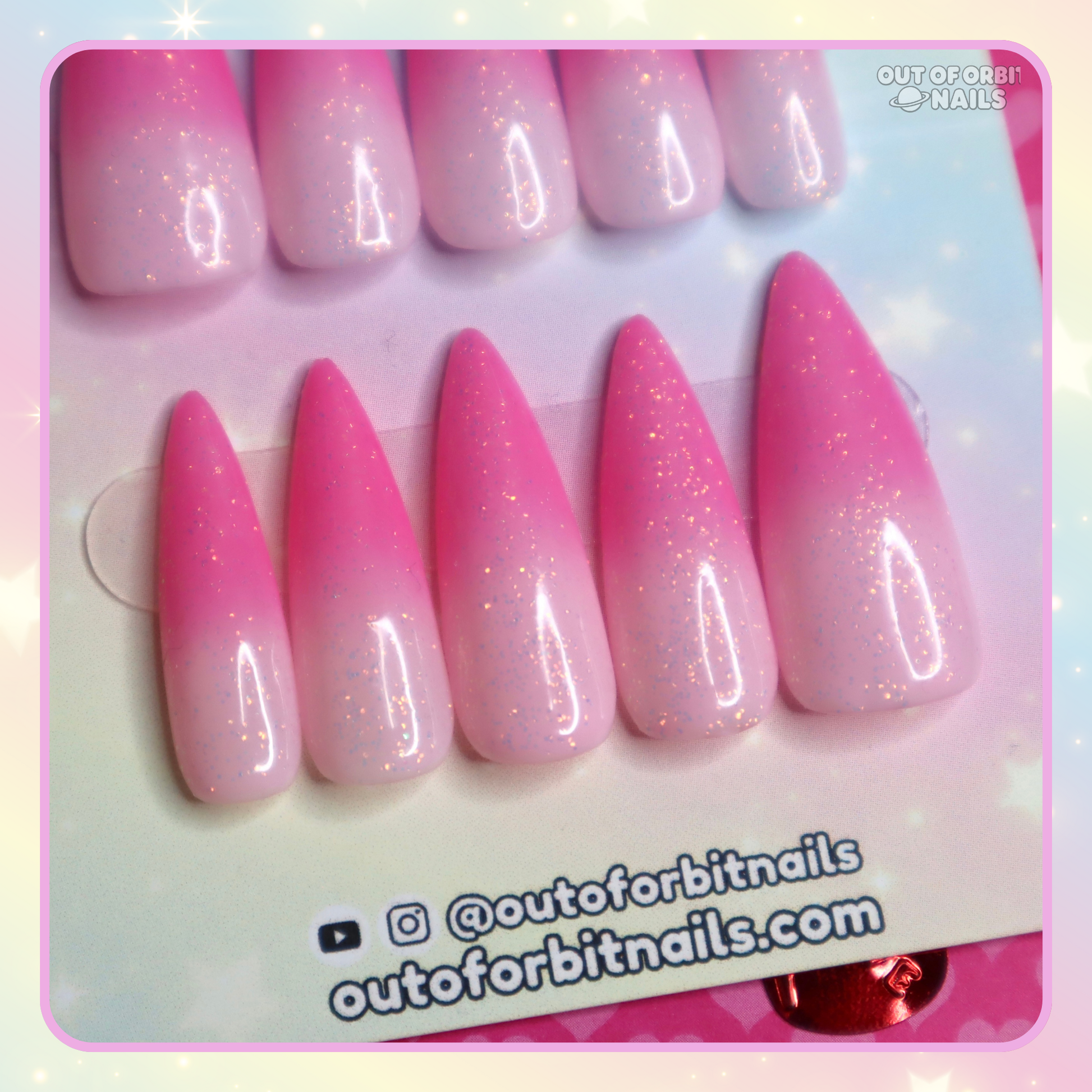 Design Features: Hand patted pink ombre design topped entirely with iridescent glitter gel over a milky light pink base.